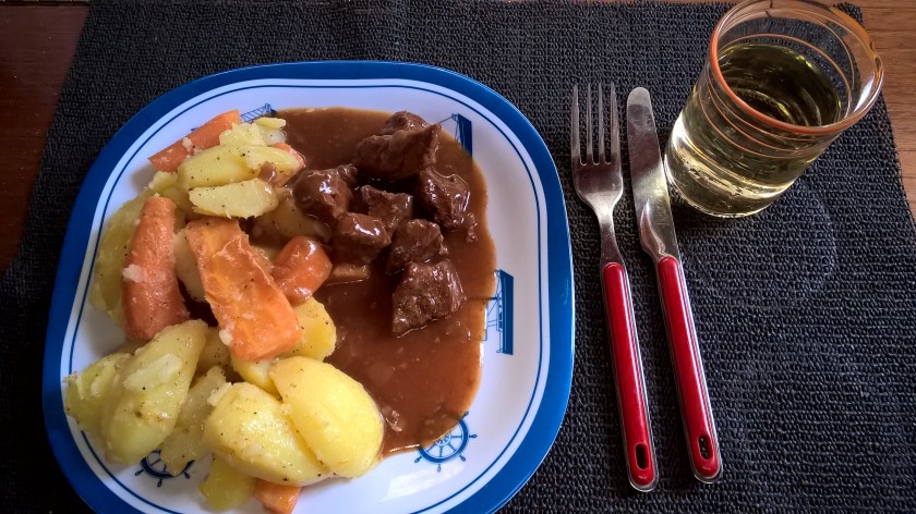 Jo, Kartoffeln mit Wurzeln in Butter geschwenkt. Dazu Meistergulasch und weil Sonntag ein Glas 🍷 Wein😊