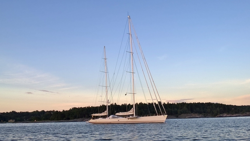 Vor der aufgehenden Sonne bietet sich uns das imposante Bild der Superyacht Marie-Cha III.