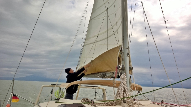 Eine gute Gelegenheit im Mainsail die Reffleinen einzuscheren.