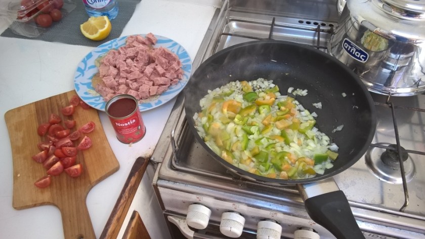 Auch unsere erste Mahlzeit auf See -griechisches Reisfleisch- konnte ich zubereiten. Allen hat es geschmeckt.