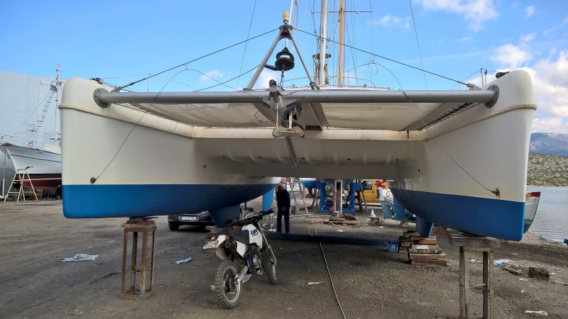 Heute haben wir den Cat, der in Kilada bei der Werft an Land steht, gründlich inspiziert. Erfreulicherweise keine grösseren Mängel. Frisches Antifouling ist aufgetragen, die Saildrives sind o.k., Maschinen sehen sauber aus, Segel o.k.