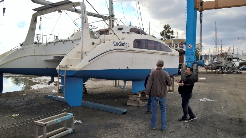 Heute haben wir den Cat, der in Kilada bei der Werft an Land steht, gründlich inspiziert. Erfreulicherweise keine grösseren Mängel. Frisches Antifouling ist aufgetragen, die Saildrives sind o.k., Maschinen sehen sauber aus, Segel o.k.