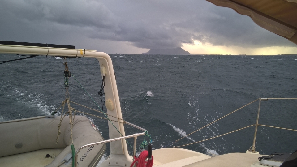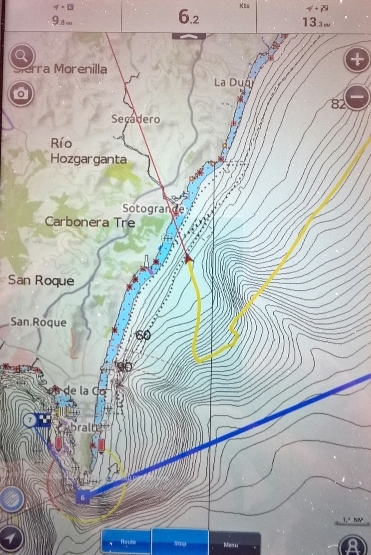 Kaum zu glauben, aber 7 sm vor Gibraltar haben wir aufgegeben. Stundenlang haben uns Schauer-Böen mit bis zu 35 kn aus WSW gequält und wir konnten uns gegen 18:00 ausrechnen, das wir für diese lächerliche Distanz noch mindestens 2-3 Stunden brauchen würden und wir auch nicht wussten welche Seegangsverhältnisse uns direkt vor dem Kap erwarten würden. Geradezu höhnisch schaute der Gibraltarfelsen wie ein Wolkenspeiender Vulkan zu uns herüber und zeigte uns wer hier das Sagen hatte.
