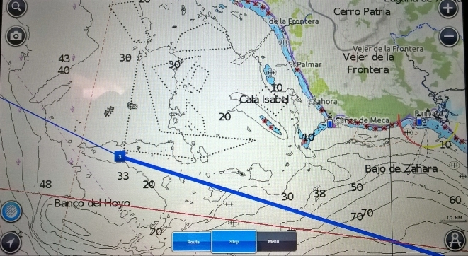 Unser nächster Wegepunkt (3) liegt ca. 25 sm entfernt querab zu Cabo Trafalgar. Zum Cap halten wir ca. 10 sm Abstand wegen der vielen Fischfarmen.