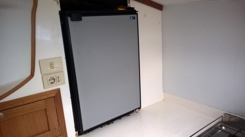 Hannes hat den Kühlschrank ausgebaut und das „Leck“ gefunden, durch das bei grober See Wasser in die Pantry gelangte: Ein Zwangsabfluß unter dem Kühlschrank im GFK-Boden.