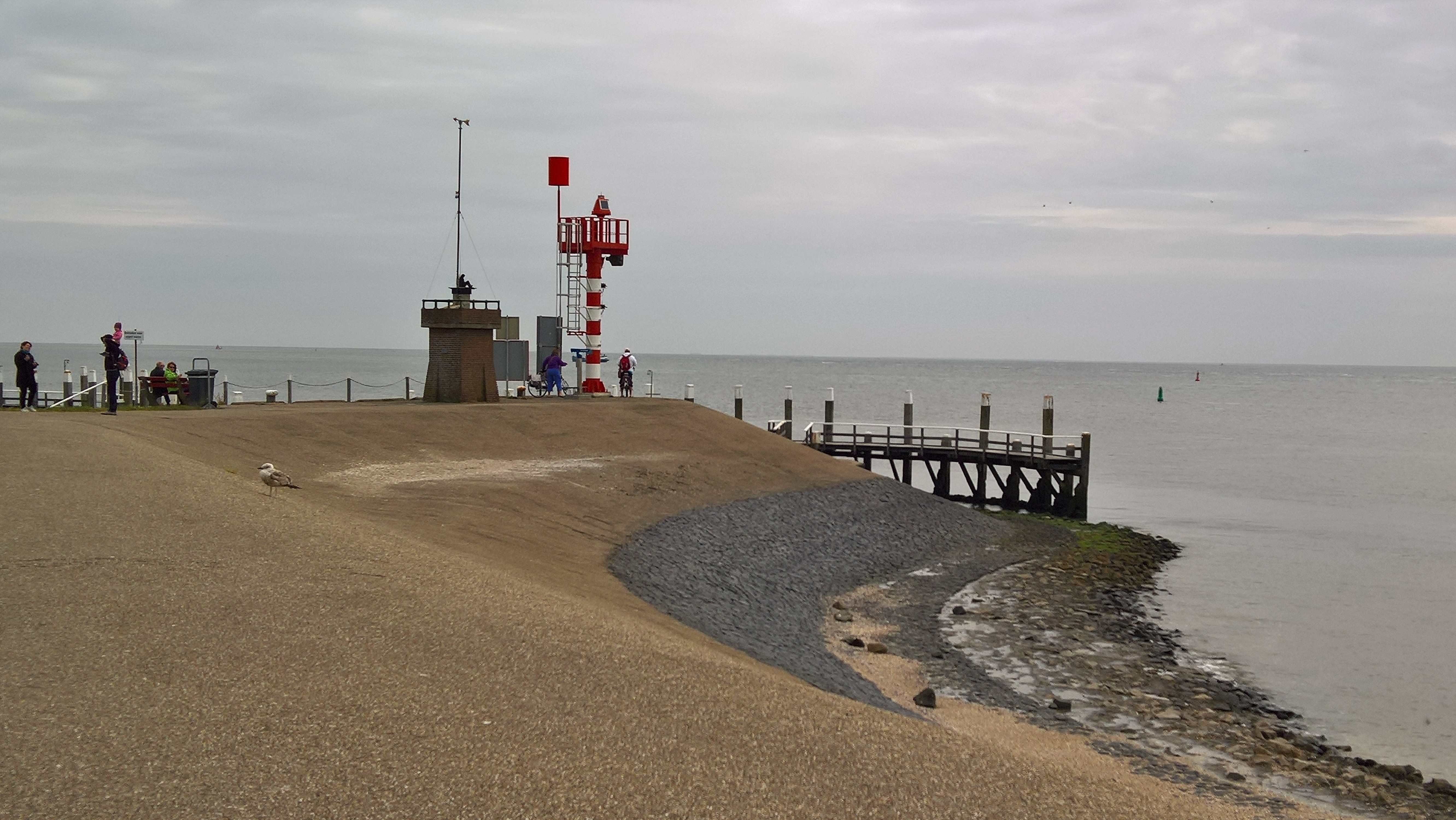 Hier liegt auch die Hafeneinfahrt mit Ausguck des Hafenkapitäns und seinen beiden gefiederten Freunden, die auf dem Deich patrouillieren.