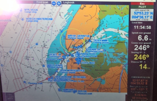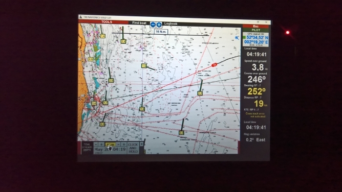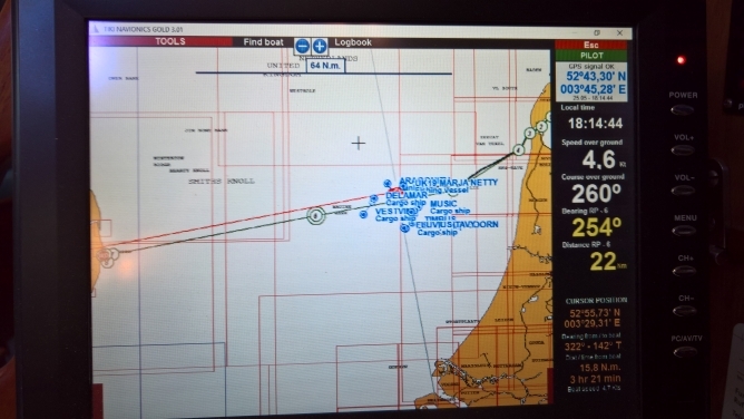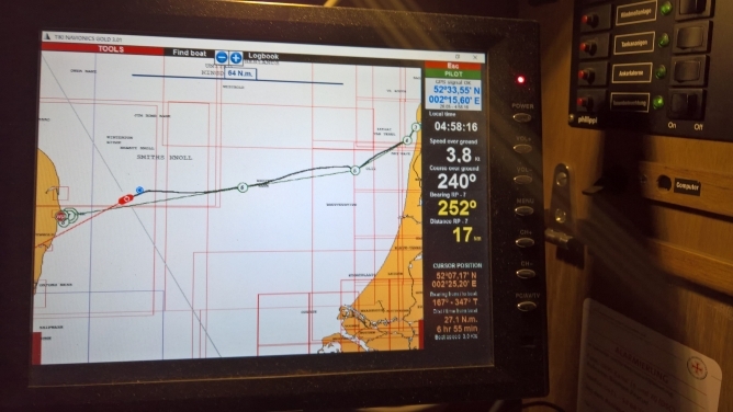 Die Wache von Gert von 24:00 bis 03:00 habe ich eingemummelt unter Deck komplett geruht, um dann relativ ausgeruht wieder zu übernehmen.. Die Tide hatte uns mittlerweile nur noch ca. 20 sm vor englischer Küste entfernt etwas nach Norden versetzt. Gert hatte wie vorgesehen nicht krampfhaft gegen gesteuert. Das Navi-Programm zeigt mächtige Tideströme und den bisher von uns gefahrenen Kurs.