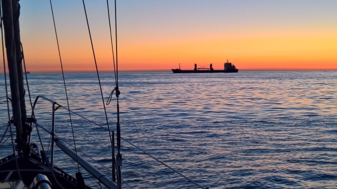 Mit aufgehender Sonne geht’s weiter.Es ärgert uns mächtig, das am Heck zwei große Segler unter Spi auftauchen. Motoren wir doch seit Texel immer noch. Kein Wunder bei dem schwachen Wind und unserer Schiffsgröße. Wir sind „erleichtert“ als auch hier nach einiger Zeit die Spi`s fallen.