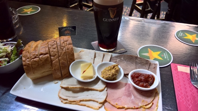 Für die Mittagspause hatten wir uns das Temple Bar Vvvviertel mit seiner alten Bebauung aufgehoben. In der berühmten Temple bar war quirrliges Leben und es gab lecker Essen und ein erfrischendes Guinness.
