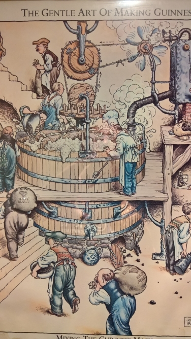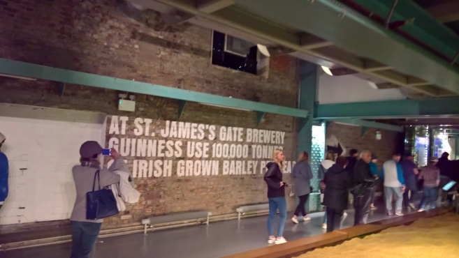 Man kann sich nicht vorstellen, wie viele Menschen den Weg dahin finden. Ein gewaltiges Entertainment Center -genannt Guinness Storehouse empfing uns. Nach Bezahlen von 2 Senioren karten ! (36 Euro) wurden wir in das Himmelreich hinein gelassen. Unter einer großen gläsernen Kuppel ging es spiralförmig Etage für Etage höherund uns wurde der Herstellungsprozess von Guiness mit zahlreichen Animationen und Ausstellungsstücken nahe gebracht. Der Himmel war dann im 7. Stock in der Grafity Bar, mit herrlichem Ausblick über Dublin und einem Freigetränk Guiness. Das hat gemundet und die quirrlige Athmosphäre unter hunderten von Leuten ist nicht zu beschreiben.