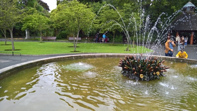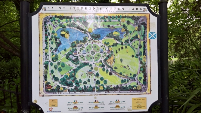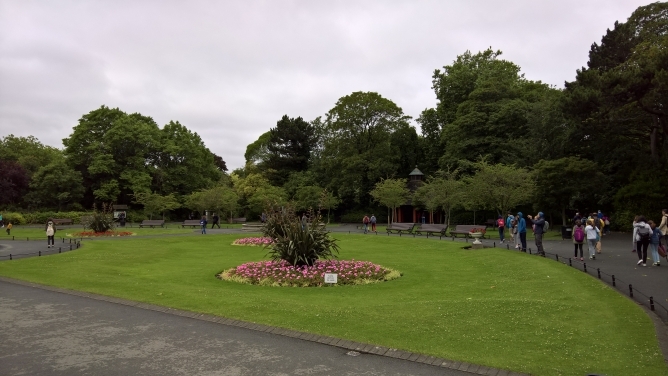 Wir hatten uns zunächst darauf konzentriert und sind vom Haltepunkt Tara Street der Schnellbahn vorbei am Trinity College hierher gelaufen. Viel Verkehr und man tut gut daran, nur bei Grün die Fußgängerüberwege zu nutzen. In der Grafton Street waren dann alle namhaften Firmen mit ihren Boutiken vertreten. Vorbei am St. Stephen´s Green führte uns der weg zum Nationalmuseum (Tolle Kuppel von Innen besichtigt) sowie vorbei am Leinster House (Regierungssitz) zur Nationalbibliothek. Hier durften wir einen Blick in den geriebenen Leseraum werfen und erfrischten uns in der Kantine mit Kaffe und Tee. Das Grün und die Blumen pracht Im St. Stephen`s Green war anschließend erfrischend für die Seele.