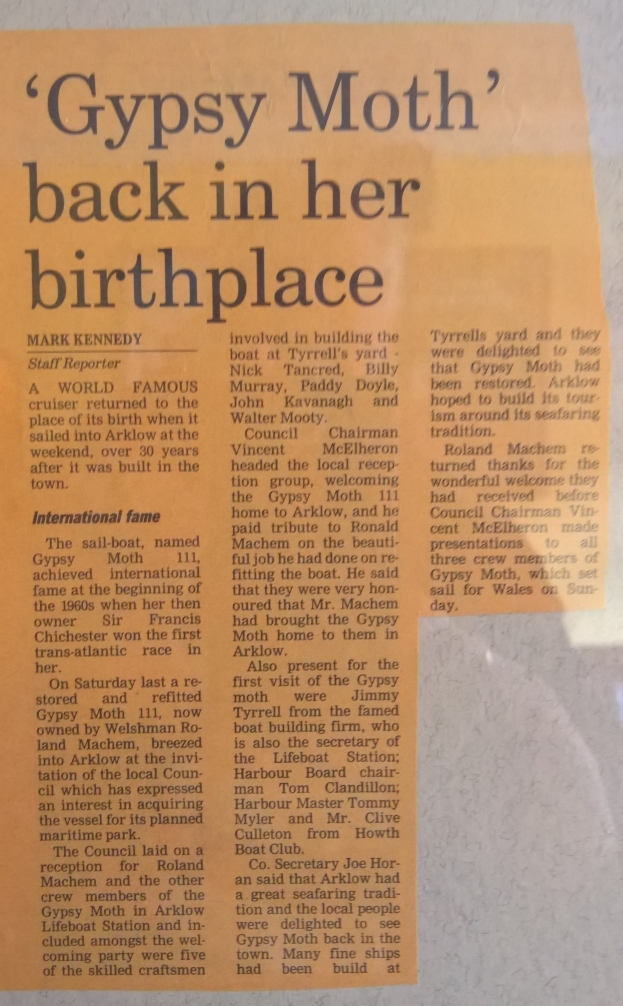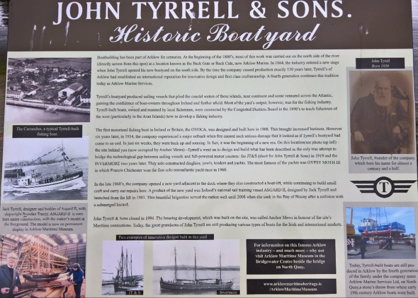 Durch eine Infotafel wurden wir auf die Schiffbauhistorie der Firma John Tyrell und Sons hier am River hingewiesen. Z.B. wurde das erste motorisierte Fischerboot Irlands 1914 hier gebaut., außerdem die Gibsy Moth III von Francis Chichester, mit der er das erste Solo Transatlantik Yacht Race in 1960 gewann. Außerdem lief hier die National Sail Training YachtAsgard II vom Stapel.