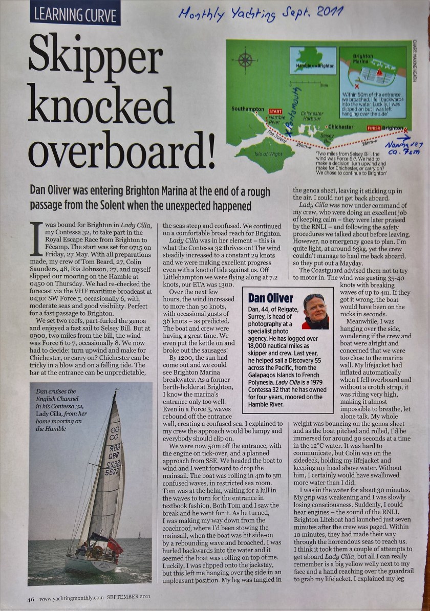 Die Versierte Crew schaffte es mit ihrem 32 Fuß Schiff bis Brighton. Dann aber passierte das Unglück. In der konfusen See direkt vor der Einfahrt von Brighton ging ein Segler über Bord und hing dann seitlich so unglücklich, das er nicht wieder hinaufgezogen werden konnte. Auch die Einfahrt in den Yachthafen gelang nur durch den massiven Einsatz der RNLI (Royal National Lifeboat Institution).