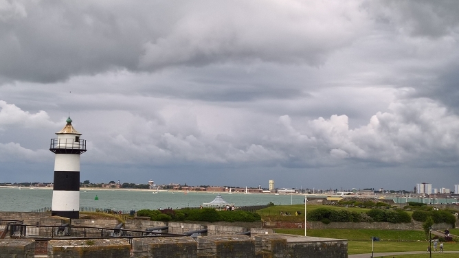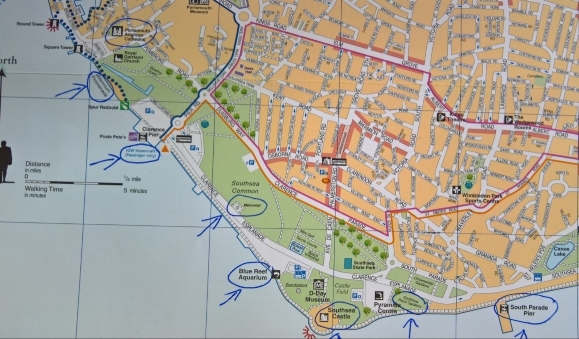 Vom Square Tower aus ging es immer in südöstlicher Richtung auf der Millenium Promenade an der See entlang mit schönem Blick auf den regen Schiffsverkehr zuwischen Portsmouth und der Isle of Wight.