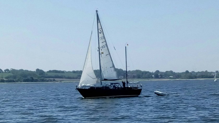 Auf der Großen Breite habe ich dann Michael getroffen, der seiner „Matrosen“ ledig nun allein unterwegs ist. Per Zuruf bestätigten wir nochmals das Anker-Treffen bei Weseby in der großen Breite.