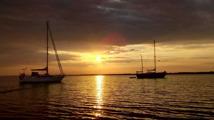 Dann zurück in die Ankerbucht in der großen Breite. Swantje und Deep Blue geben vor der untergehenden Sonne ein eindrucksvolles Bild ab.