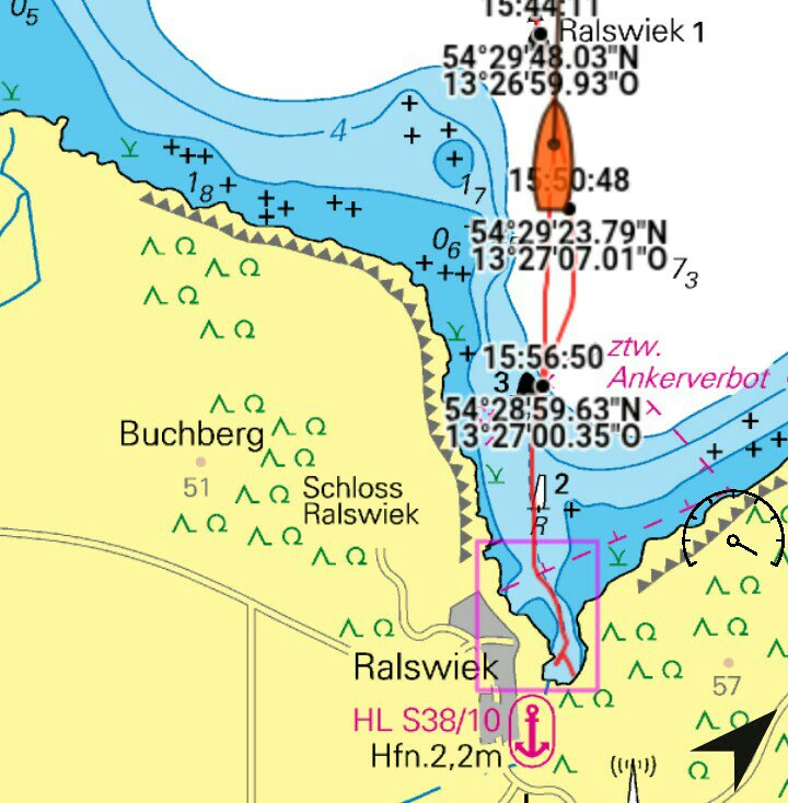 Bis zum Breetzer Bodden bei Wittow blies und der Wind noch kräftig entgegen aber im großen Jasmund Bodden zeigte Swantje was in ihr steckt und preschte mit fast 6 kn nur unter Vorsegel dahin.