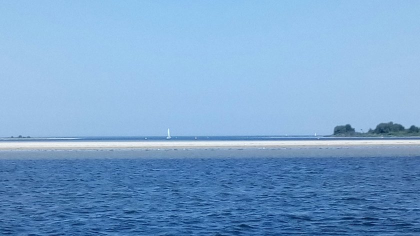 Gestern hatten wir einen langen Schlag geplant. Durch das ganze Achterwasser wollten wir Segeln-Forum bis Stralsund. Wegen des noch immer starken Ostwindes ging die Rechnung auf. Kein Motoreinband Satz. Bei Böen bis 23 Knoten verzichtete ich auf den Einsatz des Großsegels und segelte zunächst nur unter Genua und später bei stark schralenden und böigen Winden unter Fock. Michael setzte auf der Deep Blue (ein steifes Schiff) alle Segel und war als Einheimischer verdient ca. 1,5 h eher in Stralsund. Macht nix. Man muß teilweise sehr aufmerksam Steuern, manche Untiefen sind nur wenige Meter von der Betonnung entfernt. Bei Bug begeisterte mich die Aussicht auf einen hohen Sand.