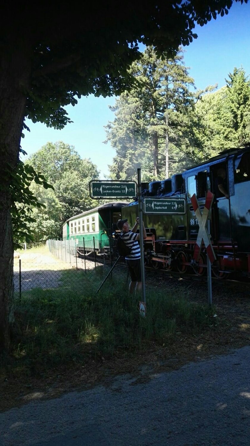 Über Blies how dann weiter zur Bahnstation Garftitz. Hier machen wir Rast und beobachten die Vorbeifährt des „Rasenden Roland“. Diese historische Schmalspurbahn dämpft seit mehr als 120 Jahren mit 30 km/hat Höchstgeschwindigkeit auf einer Strecke von 24 km von Putbus nach Göhren. Ein Technikerlebnis und Eisenbahn-Romantik.