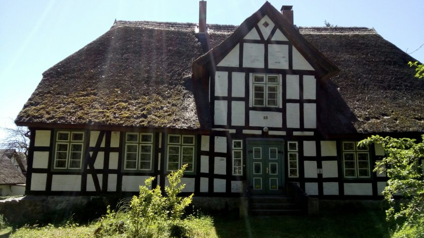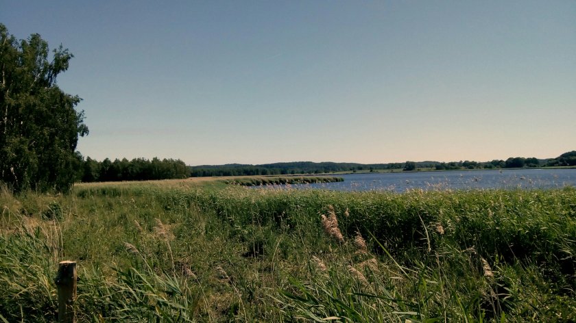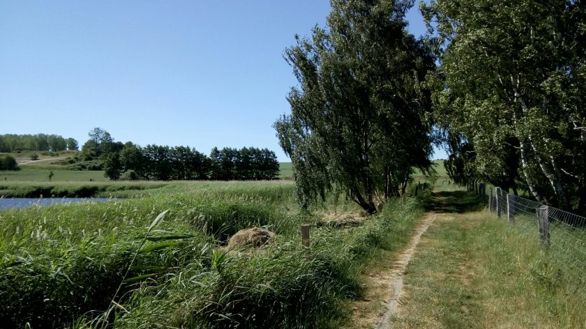 Zunächst ging’s an Schilf gesäumten Neuendiener See entlang und dann durch einen Baum gesäumten Hohlweg. In Lancken-Granitz erreichen wir die kleine Kirche, die gut sichtbar auf einem Hügel steht.