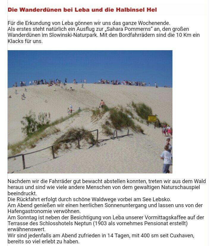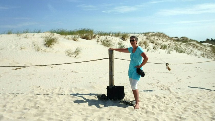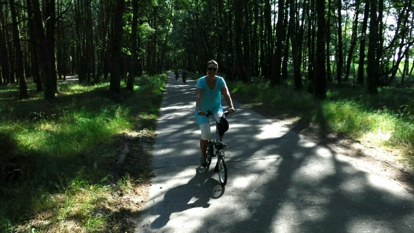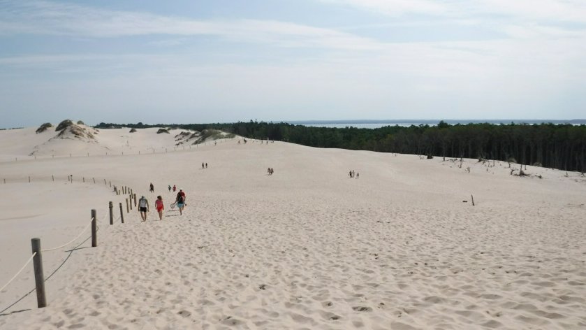 Mit unseren Rädern fahren wir kilometerlang zunächst durch Wald, der zwischen der Lebaer-Nehrung und dem Lebsko See wächst. Autoverkehr ist untersagt, wenig Radfahrer, viele Fußgänger und noch mehr Personen, die sich mit den flinken Elektrofahrzeugen befördern lassen. Zu Fuß bis zum Aufstieg auf die Dünen ist es doch ziemlich weit.