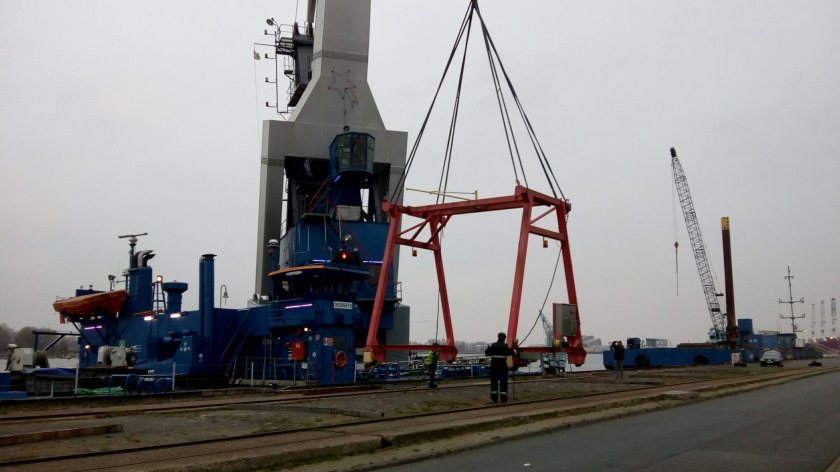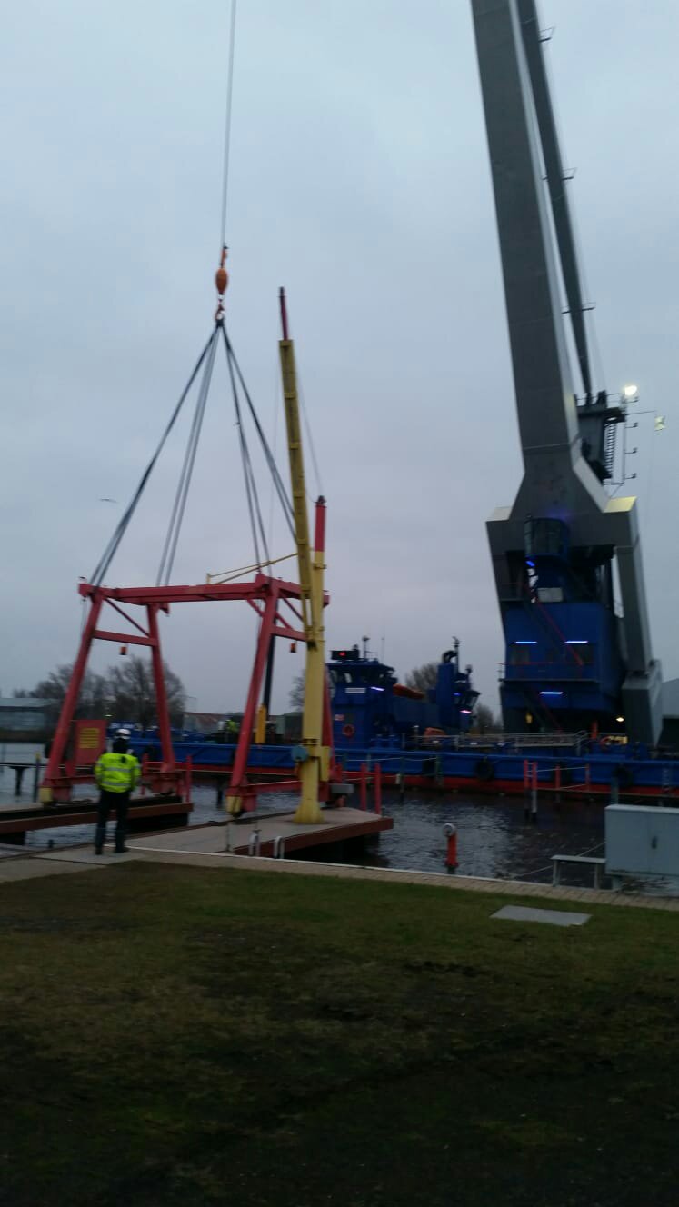 Eine gründliche Überholung mit Kontrolle der Schweißnähte und neuem Farbauftrag war notwendig. Dazu sollte der Kran in einem Stück ohne die 4 vorher abgebauten Kettenzüge per Schwimmkran zu einem Fachbetrieb im Fischereihafen transportiert werden.