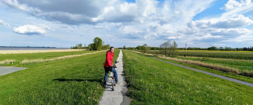 Das wechselhafte Wetter Mitte Mai animiert mich zu einem Landausflug zur Elbinsel Krautsand mit unserem Reisewohnwagen. Ilse freut’s.