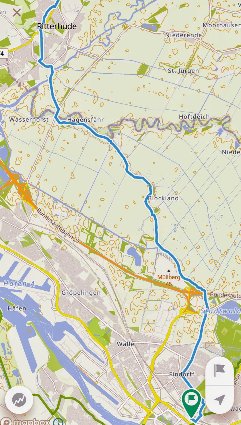Dienstag 30.07. packte ich es endlich an. (Bremen (50 km eine Strecke) sollte mein Ziel sein. Bei der Routenwahl verließ ich mich auf bikemap.net und habe mir die entsprechende App auf dem Android-Smartphone installiert. Hier hat man Auswahl unter einer Vielzahl Rad-Routen und Beverstedt-Bremen war auch dabei.