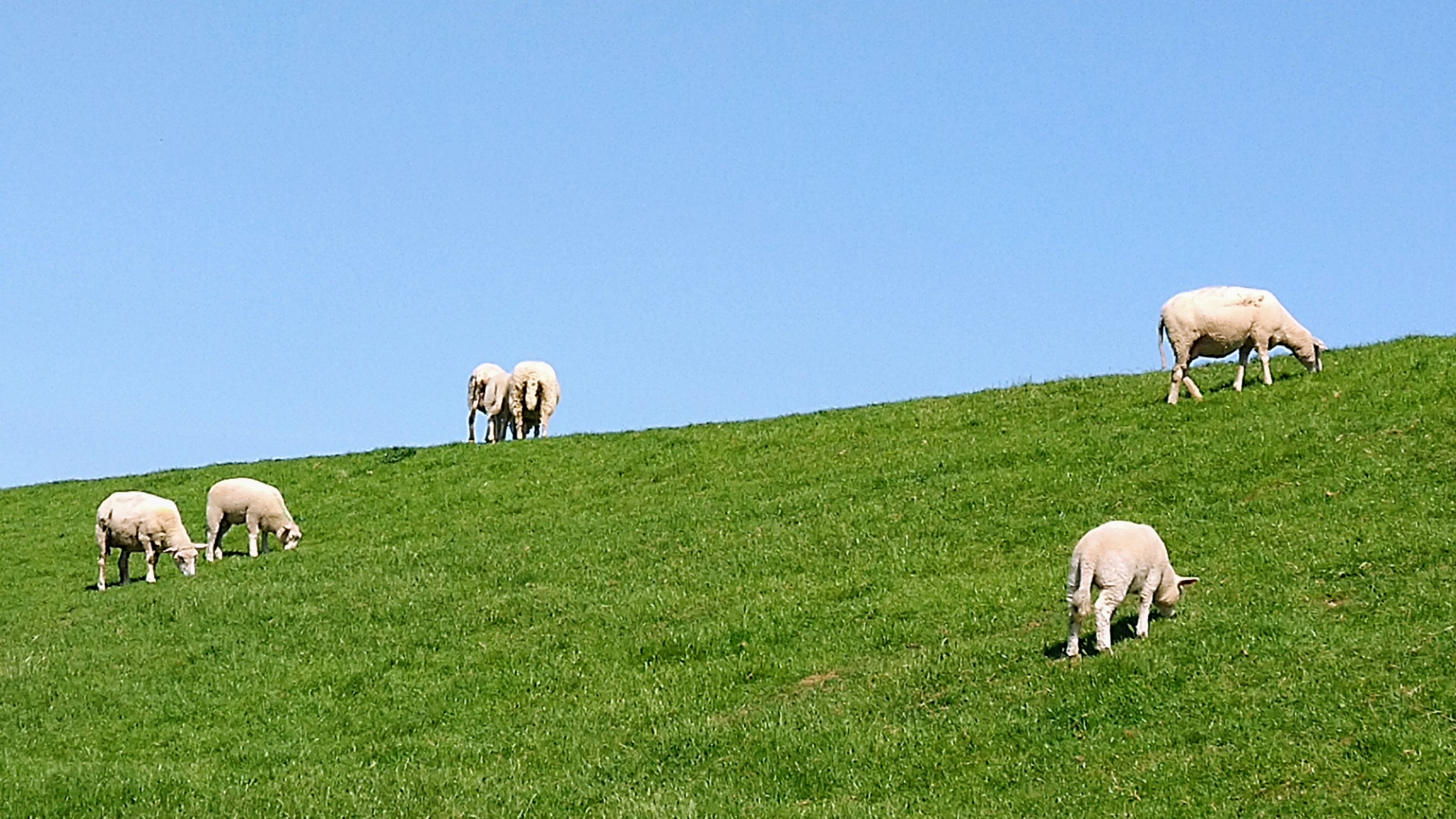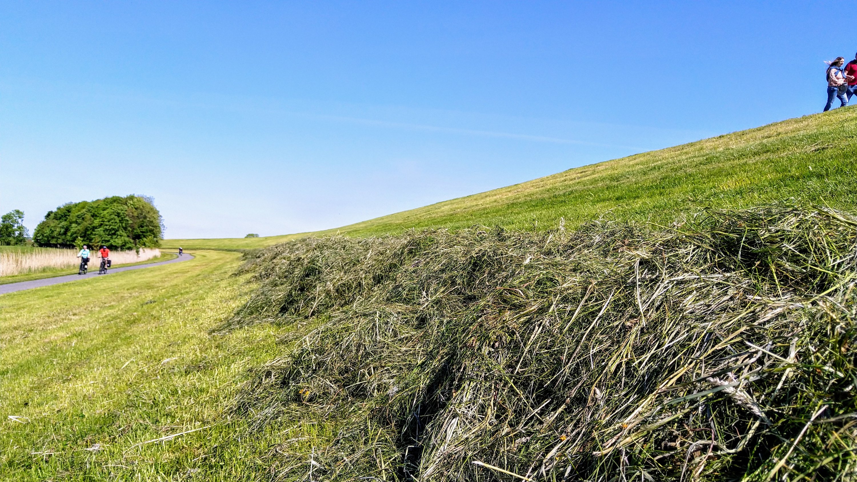 Der Blick am Sperrwerk rüber zum Fähranleger Wischhafen, die vielen Tiere am und hinterm Deich und von der Deichkrone genossen wir bei kurzer Rast den weiten Blick übers Vordeichgelände.