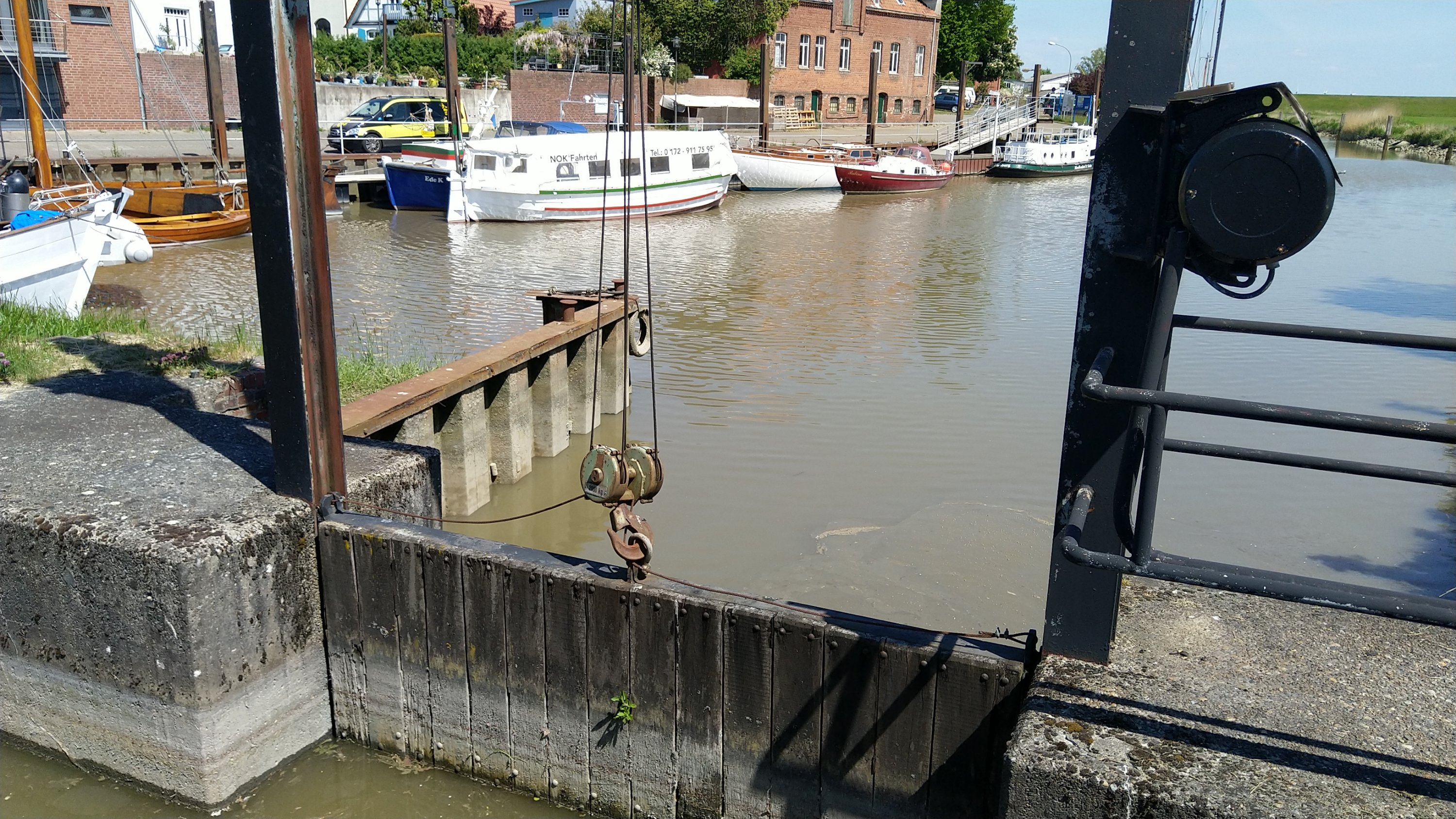 Von weitem sahen wir dann schon den Kirchturm von Freiburg radelten aber im Vordeichgelände zunæchst zum diesseitigen Haupt des Sperrwerkes.