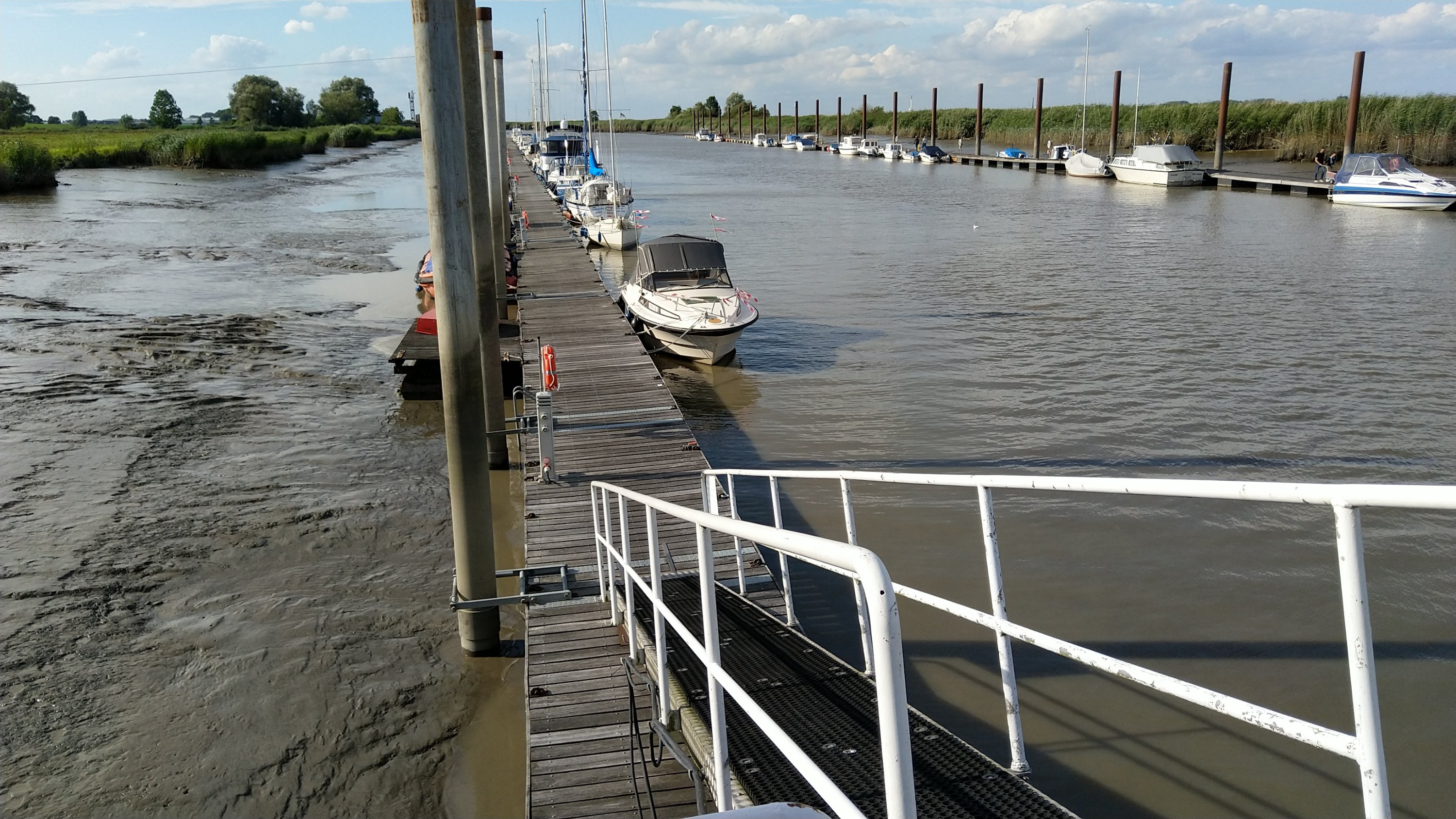Kurz danach ging’s in den Ruthenstrom mit einer ultralangen Steganlage des WSDE (beiderseits je 450 m !) aber vorher noch an der Hatecke-Werft vorbei die fūhrend im Bau der selbstaufrichtenden Rettungsboote ist.