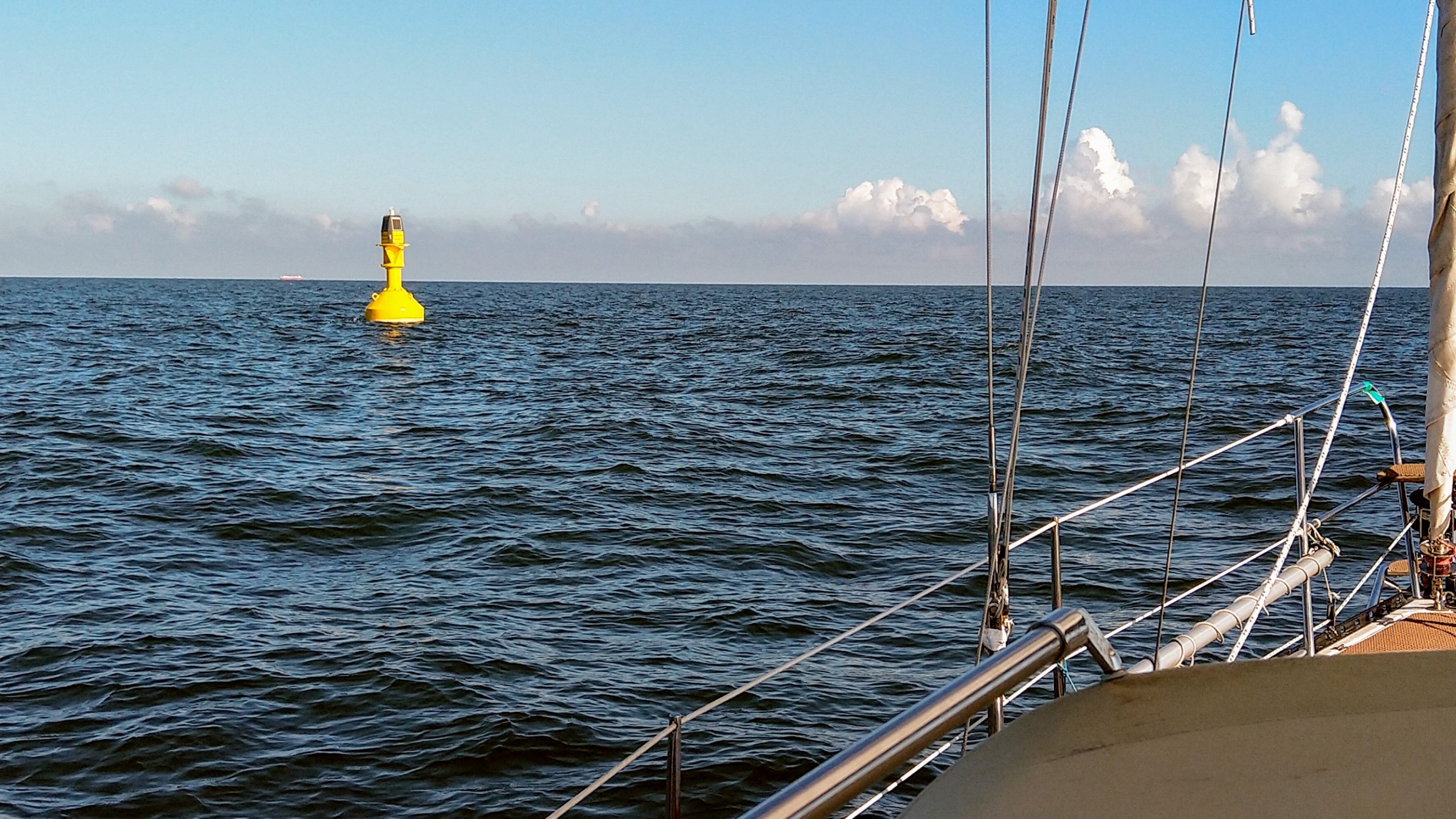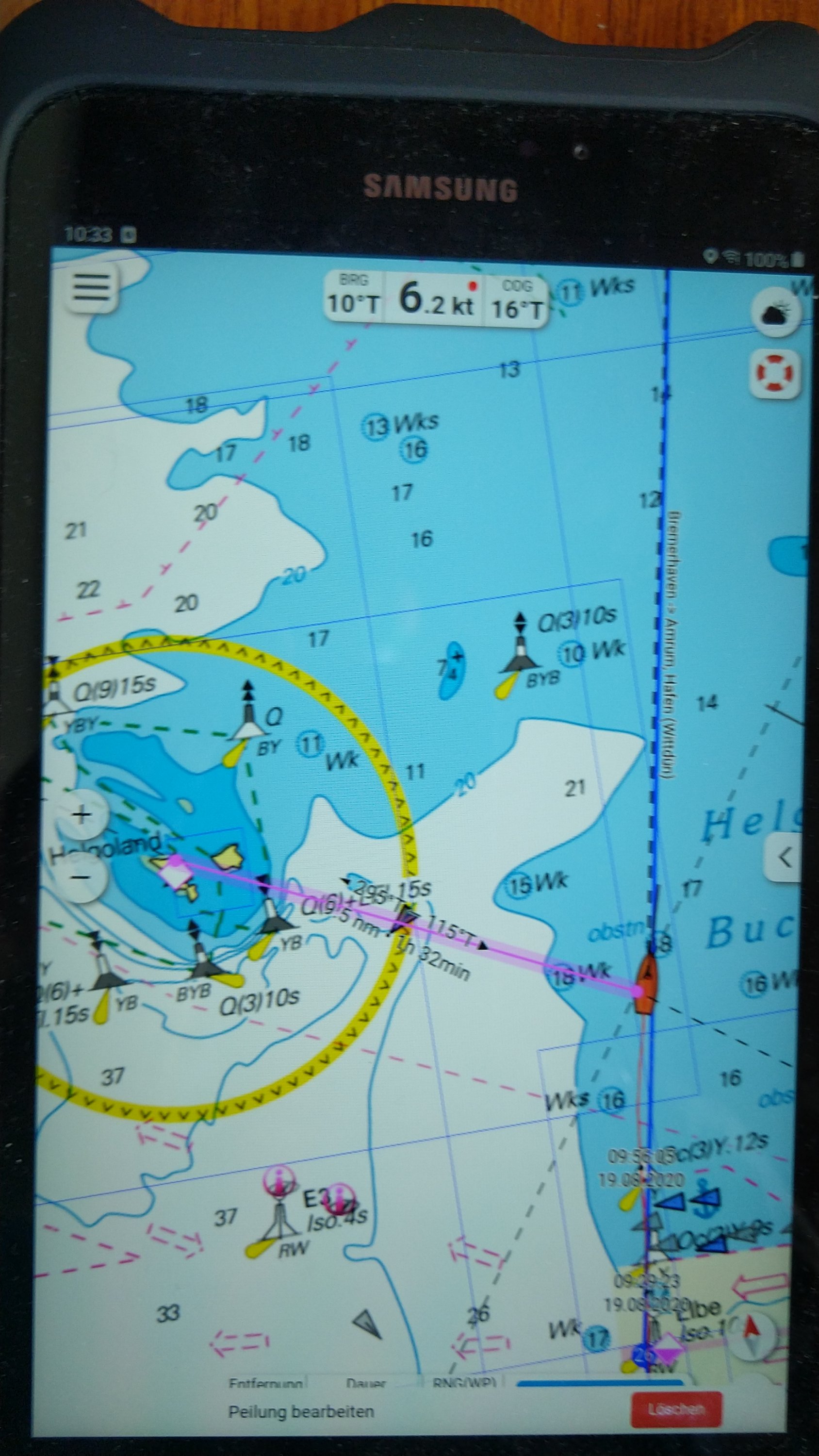 Spannend würde dann einige Zeit später das Verkehrstrennungsgebiet in der Zufahrt zur Elbe, welches ich am seewärtigen Rand kreuzte. Hilfreich da die elektronische Seekarte auf dem Tablet, welches die Position der Großschiffe anzeigte. Die AIS Positionen der Schiffe werden per WLAN dort eingeblendet. Einem Flusskreuzfahrschiff auf Kollisionskurs kann ich so durch Reduzierung der Fahrt problemlos ausweichen und auch an der Reede komme ich problemlos vorbei.