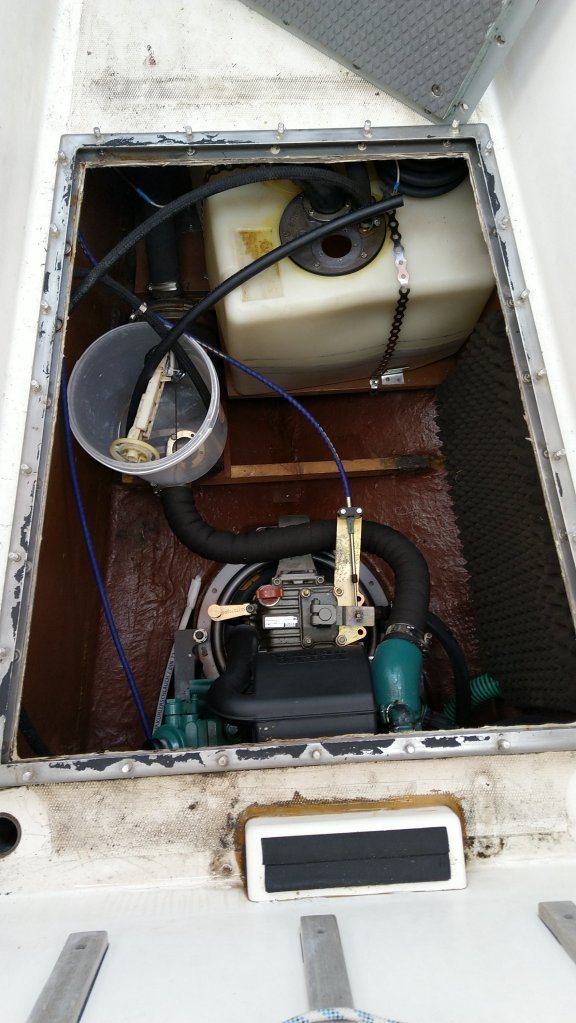 Also meine Küchenbude (Peter sagte immer Zirkuszelt) aufgebaut und im Cockpitfußboden den Deckel geöffnet um an den hinter dem Motor untergebrachten Tank ran zu kommen. Gut, das ich diese Öffnung vor etlichen Jahren bei der Auswechslung des Volvo-Motors installiert hatte!