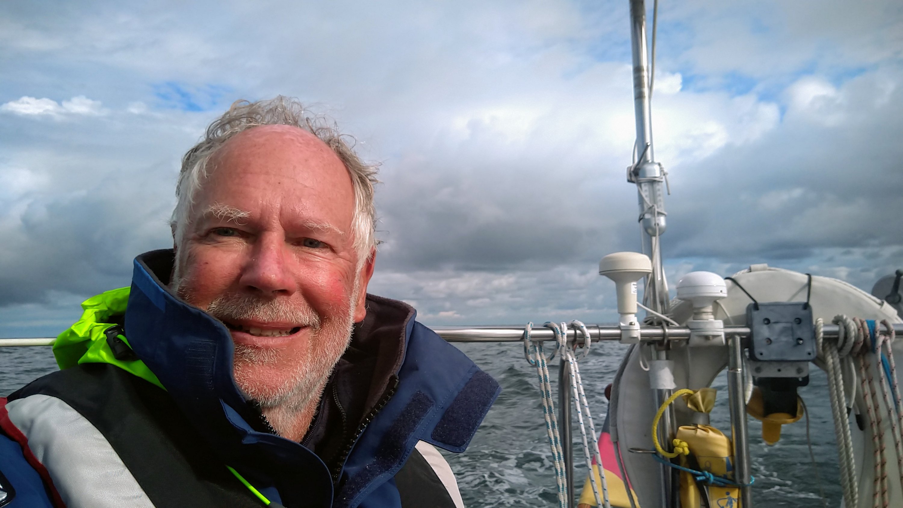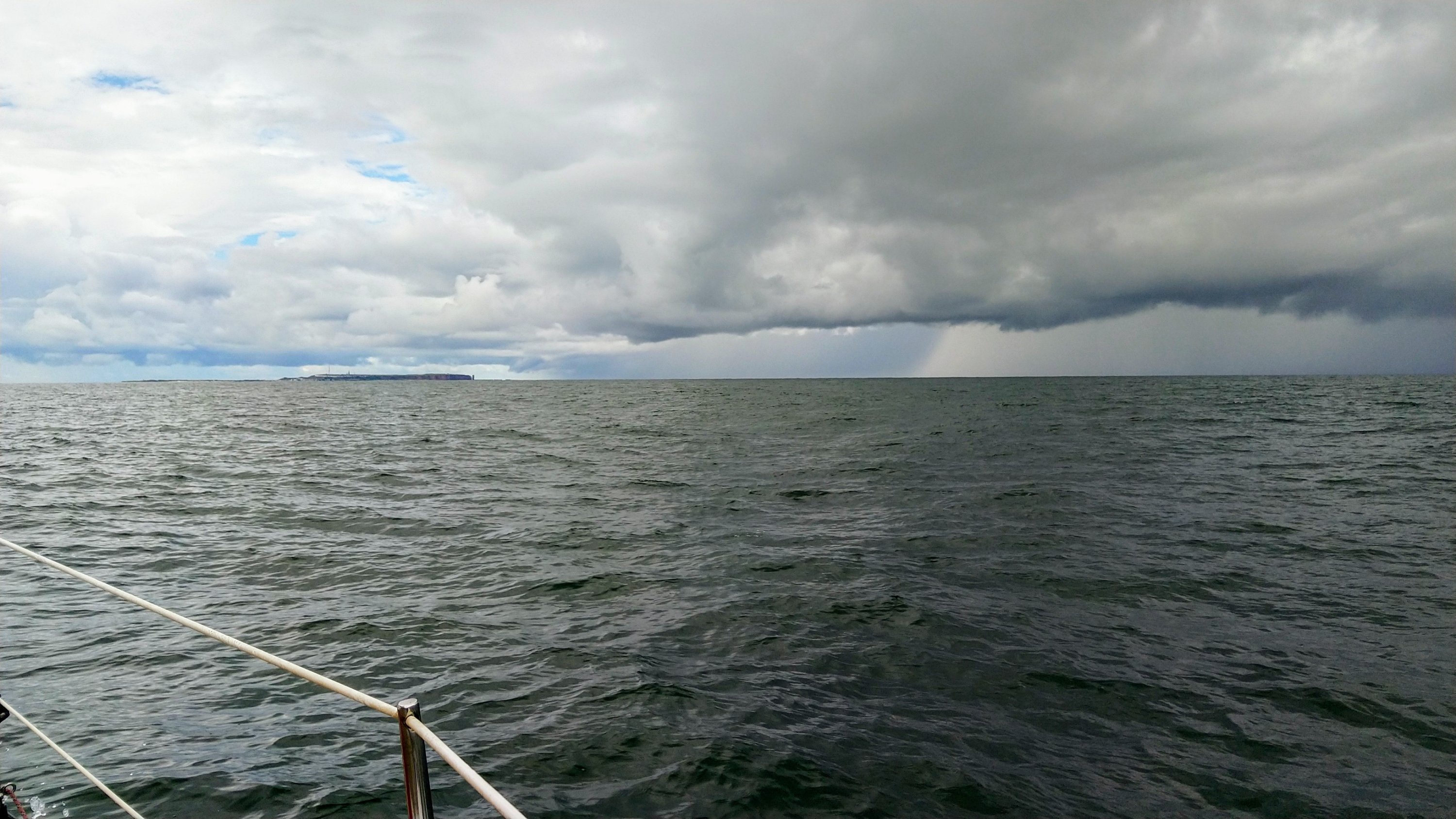 Zeitweise kam sogar ein wenig die Sonne raus und bald kam Helgoland in Sicht und ich dachte schon unbehelligt bis Helgoland zu kommen. Aber ca. 6 sm vorher näherte sich rasch eine Front – ich barg sicherheitshalber das Groß – und ließ eine kurze starke Windböe und den Regenguss über mich ergehen.