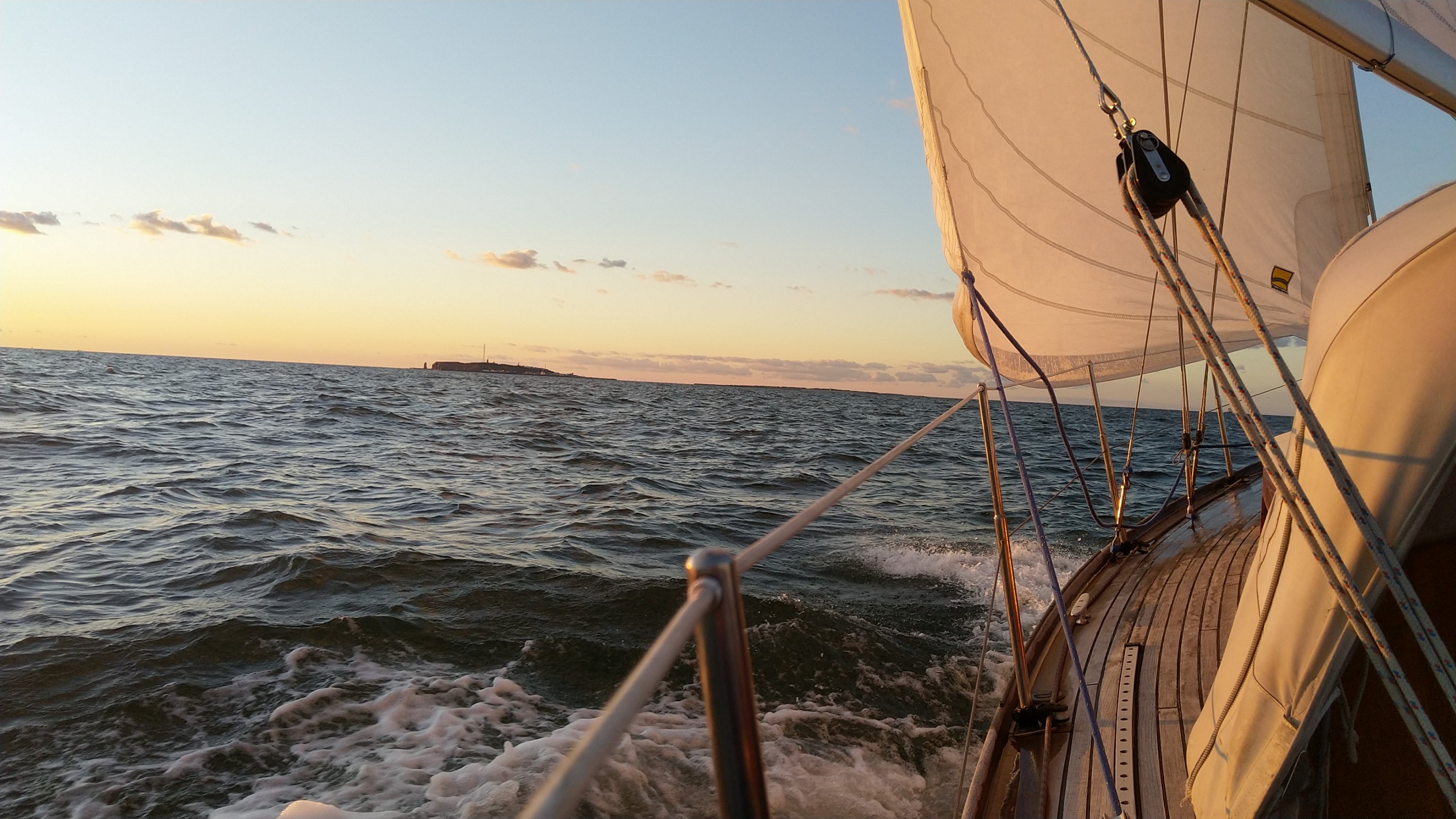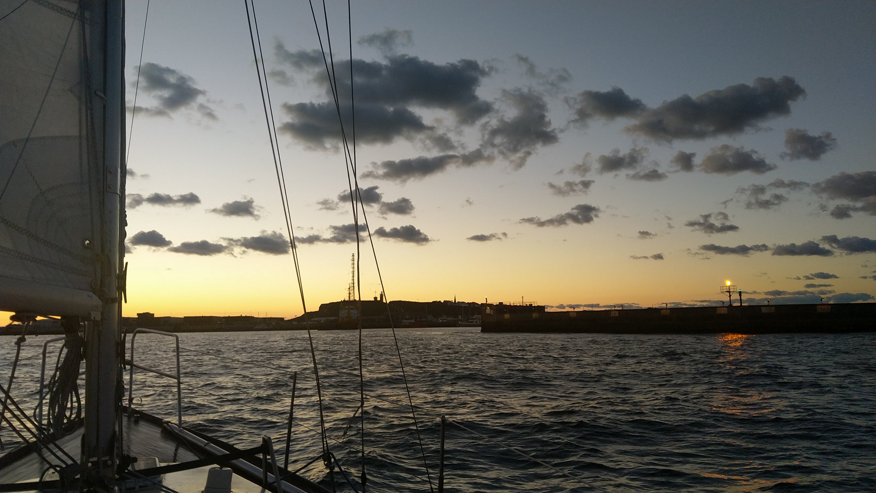 Vorgestern hatten wir mit NO 4 ideale Bedingungen um Helgoland anzusteuern. Schon kurz nach den Containerbrücken in Bremerhaven gingen die Segel hoch und bereits nach 7 h hatten wir im Licht der untergehenden Sonne den Roten Felsen erreicht.