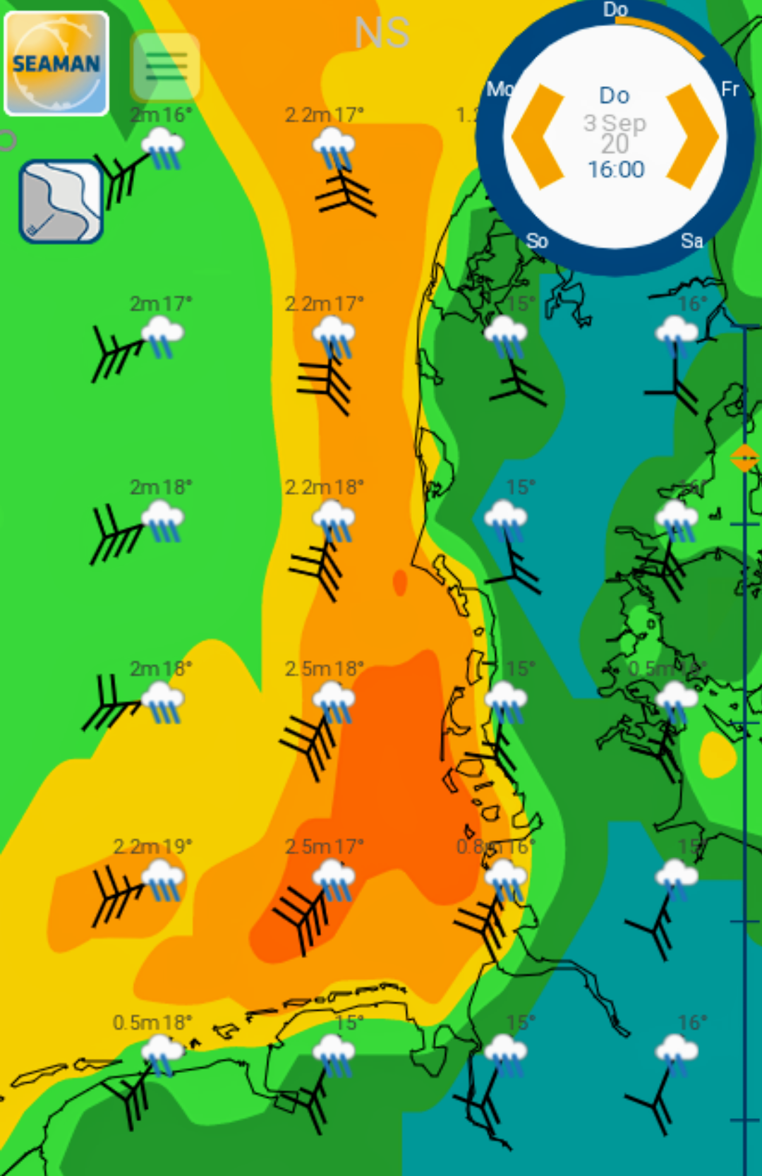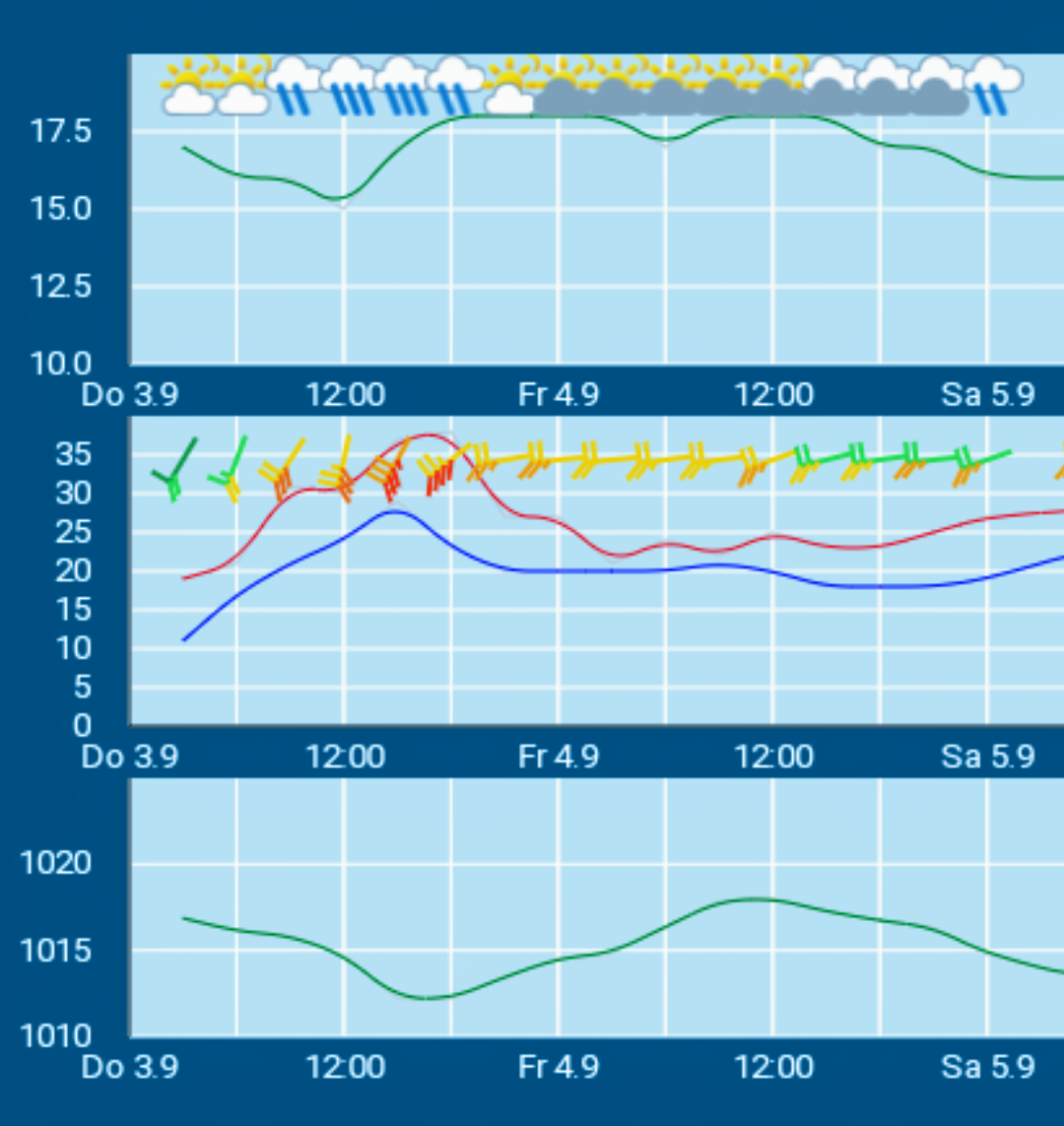 Starke Böen, die gegen 16:00 mit 7 Bft ihr Maximum erreichen sollen und ekliger Regen.