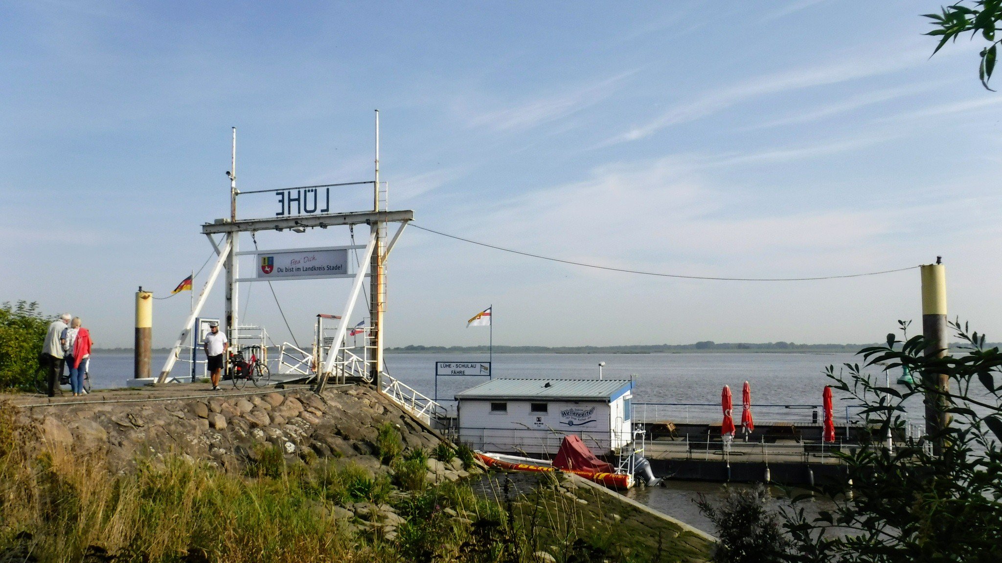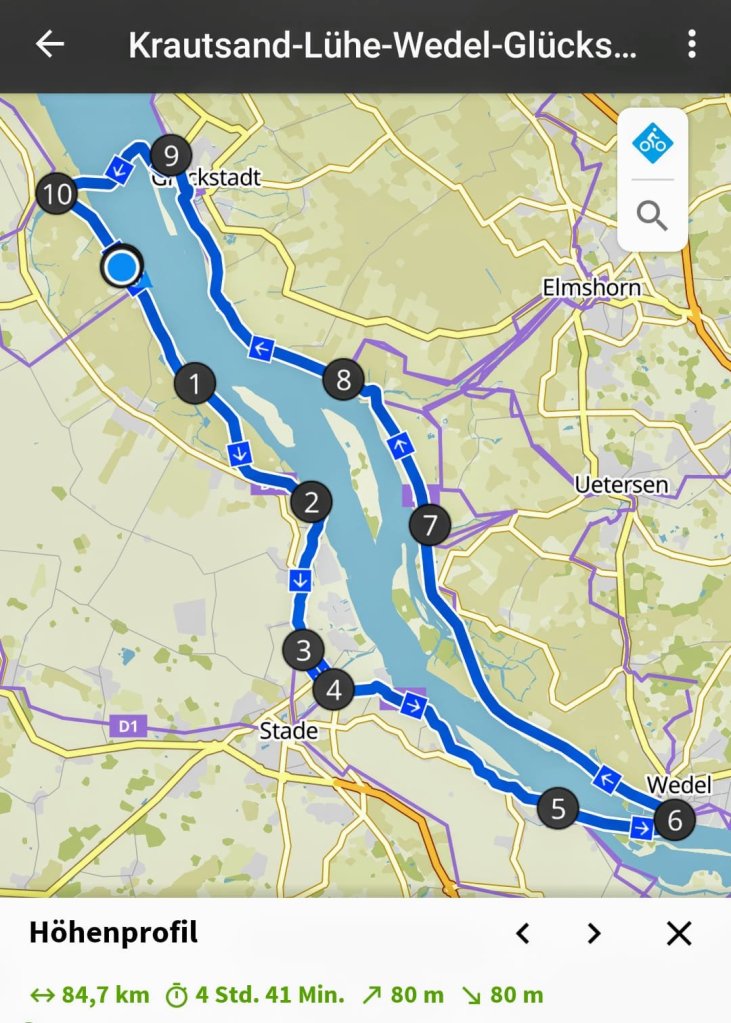 Und heute hab ich endlich die Radtour gemacht, die ich schon immer mal vorhatte: Rundtour beiderseits der Elbe unter Nutzung der Fähren bei Lühe und Wischhafen.