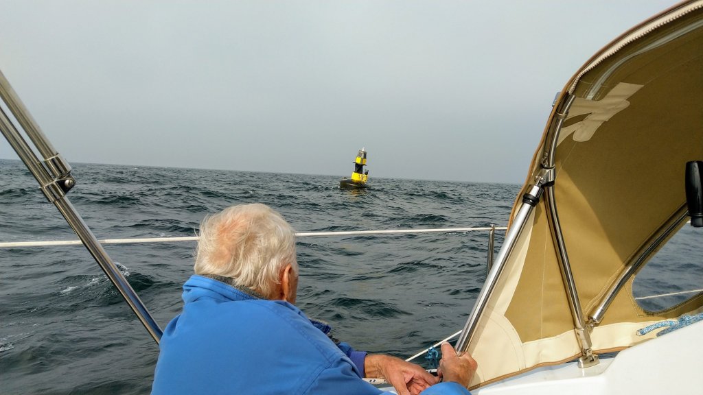 Fantastisch wie unser Windpilot bei jetzt 2 m Welle und in Böen 5-6 sowie nahezu achterlichem Wind akkurat steuert. Zur Sicherheit haben wir aber eine Bullentalje angebracht, um ein unbeabsichtigtes Umschlägen des Großbaumes zu verhindern.