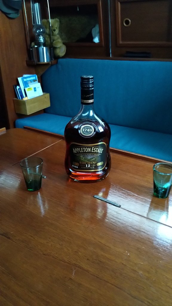 Bei unser Rûckkehr entdecken wir eine Flasche feinsten Jamaica-Rum. Detlef ist als Wohltäter schnell geortet.