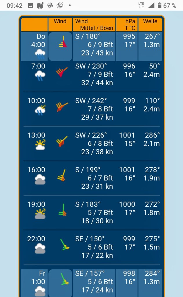 In der Nacht Briest der Wind wie vorhergesagt stark bis auf 8bft in Böen auf.
