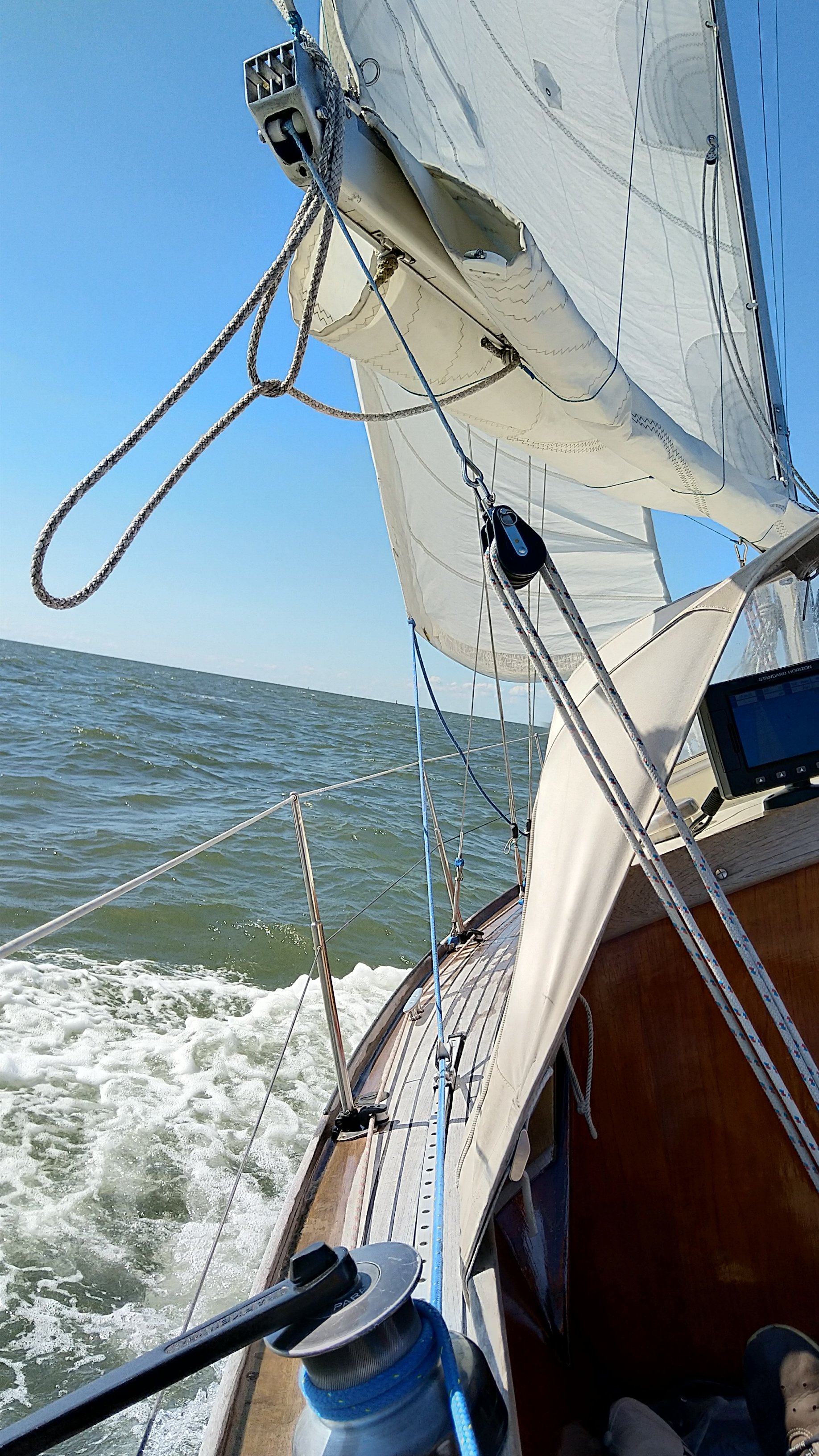 Vorgestern hatten wir mit NO 4 ideale Bedingungen um Helgoland anzusteuern. Schon kurz nach den Containerbrücken in Bremerhaven gingen die Segel hoch und bereits nach 7 h hatten wir im Licht der untergehenden Sonne den Roten Felsen erreicht.