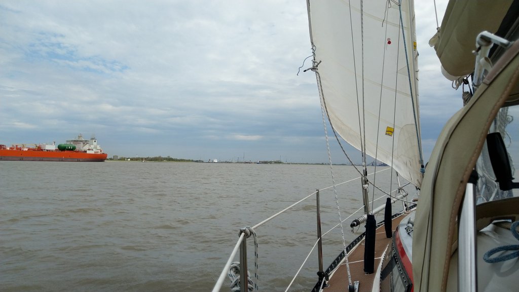 Wie zu erwarten hatten wir nach Passage von Leuchtturm Alte Weser und den Nordergründen später auf der Elbe noch einige Zeit mit dem ablaufenden Wasser zu kämpfen, das unsere Fahrt um einiges reduzierte. Und kalt war es auf dem Wasser (12 Grad Celsius), nur ab und an kam vom Festland ein spürbarer Schwall Warmluft.