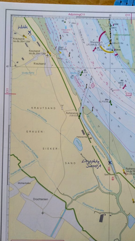 Gegen 13:00 bogen wir kurz hinter Wischhafen und Krautsand (hier steht Ilses Wohnwagen) in den Ruthenstrom ein.