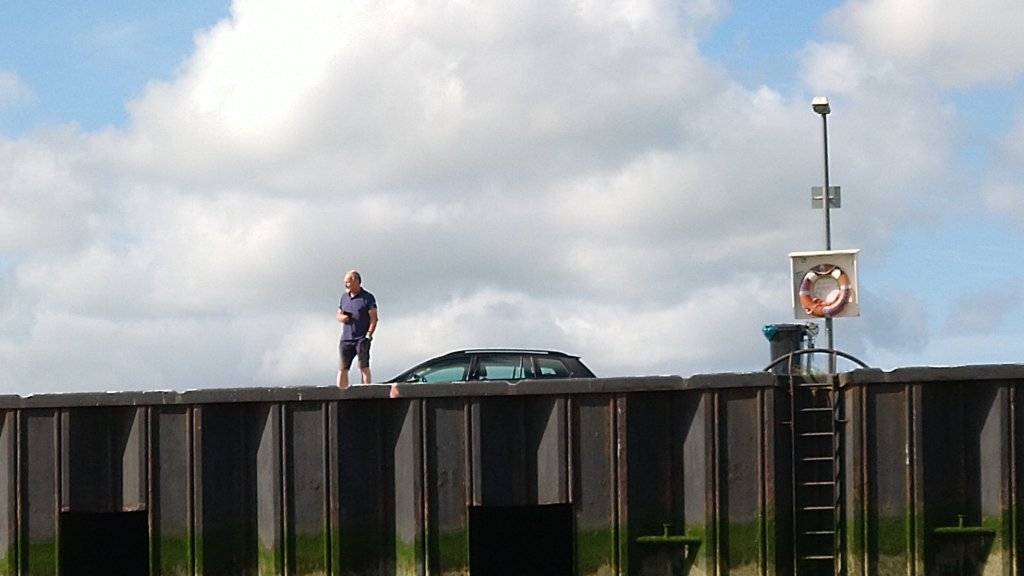 Manfred ist gerade an der Geestemole und macht ein feines Foto. Lustig wie klein sich das Bötchen vor der Geestemole ausmacht.