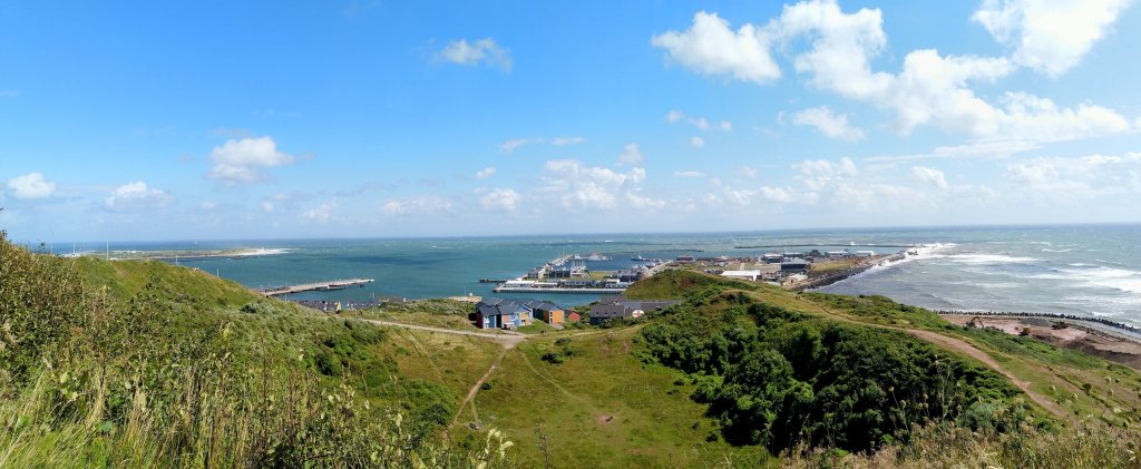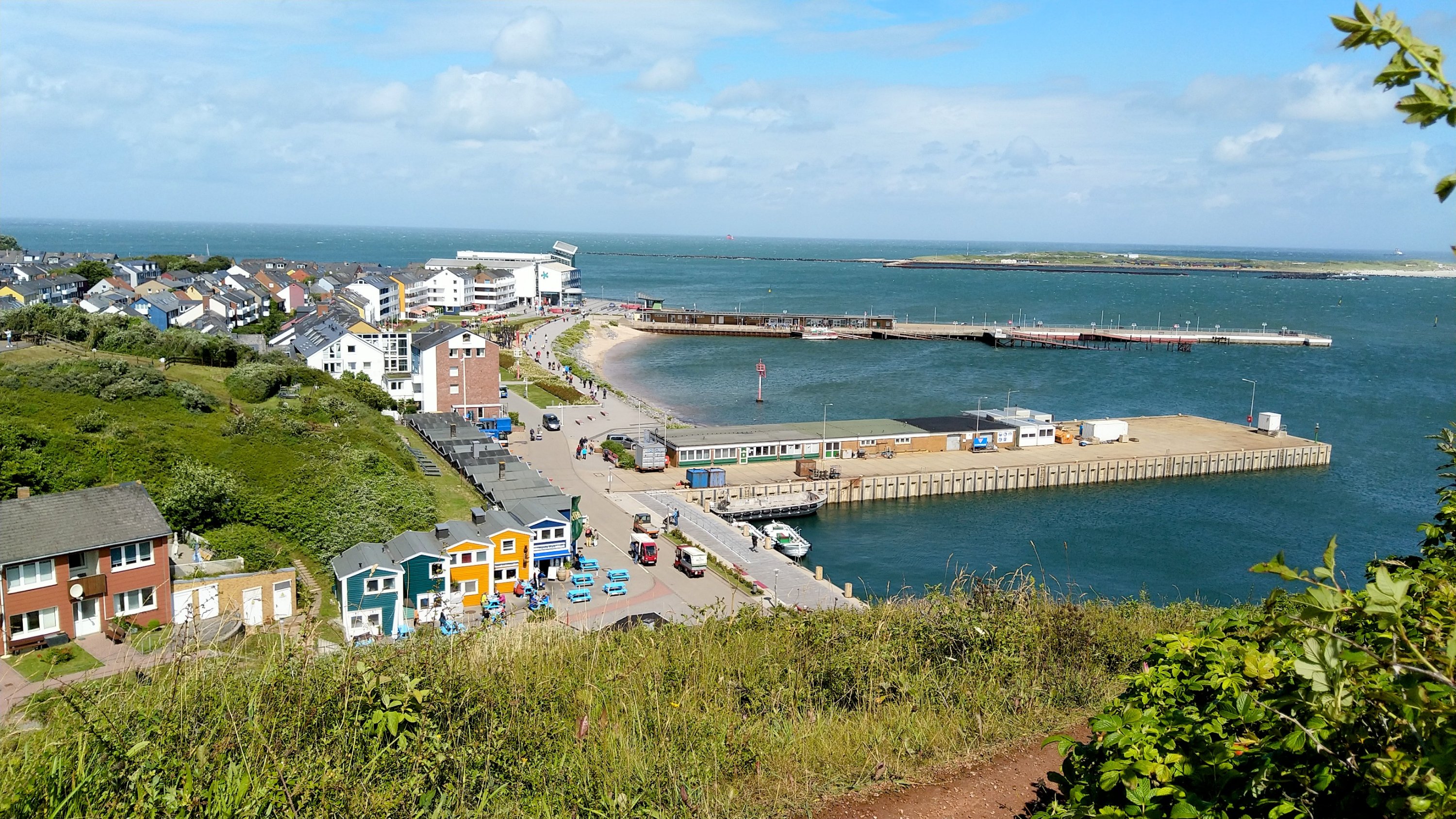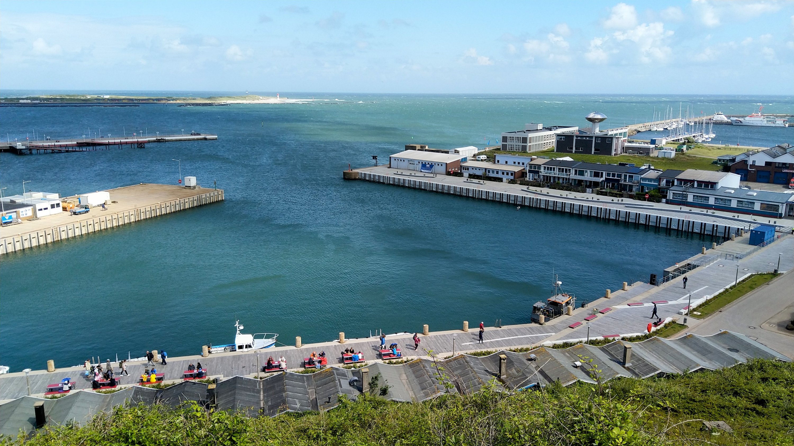 Auch in andere Richtungen bieten sich herrliche Ausblicke: Südhafen (wo auch ich liege), neu gestalteter Binnenhafen und Richtung Düne (im Vordergrund die „Bunte Kuh“.