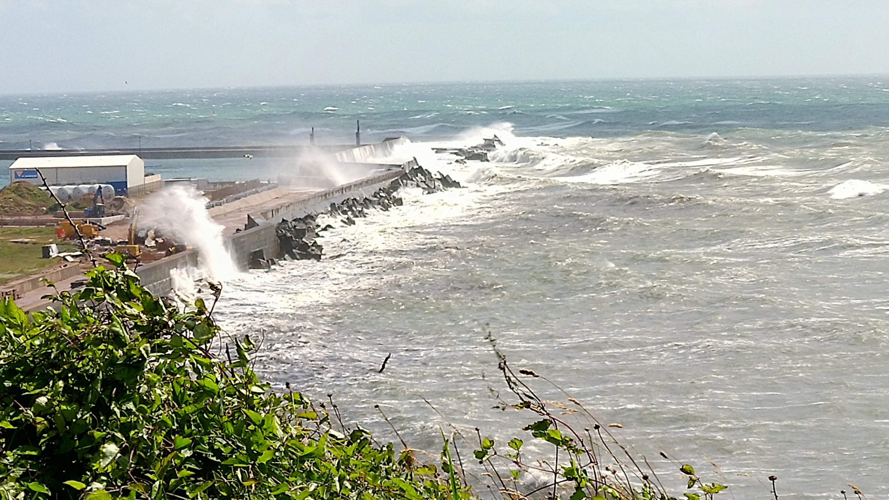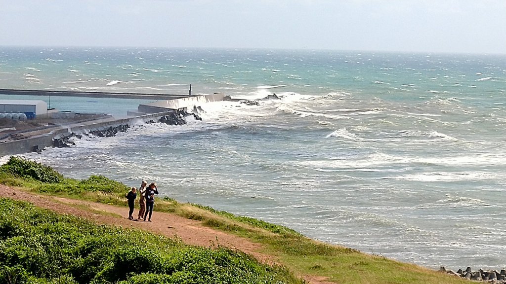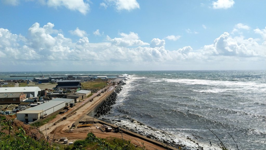 Von hier oben bietet sich ein faszinierender Ausblick. Und zunächst lenke ich meinen Blick auf die brechenden Wellen vor den Molen des Südhafens.