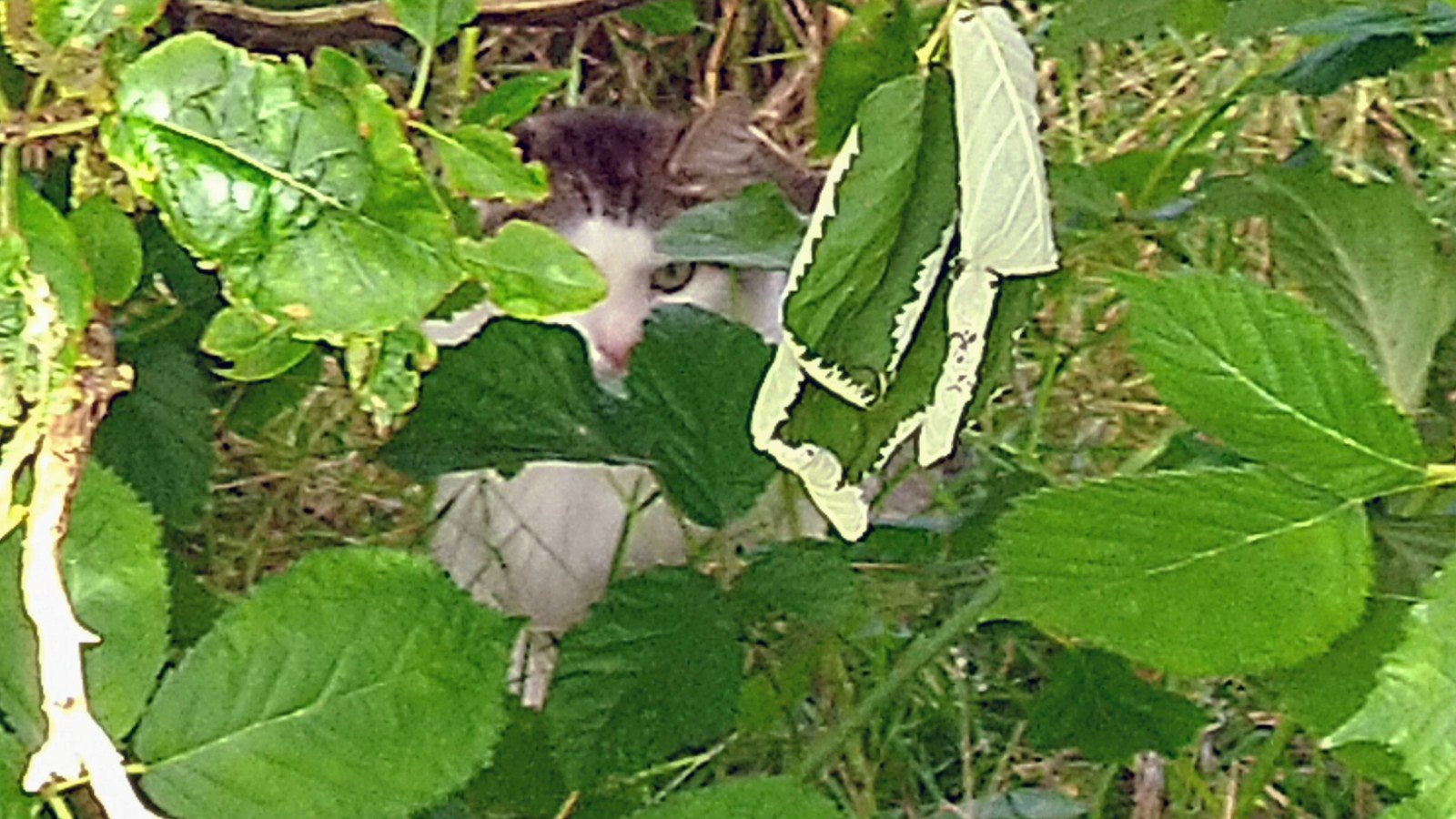 Eine Katze beäugt mich mißtrauisch aus ihrer Deckung.