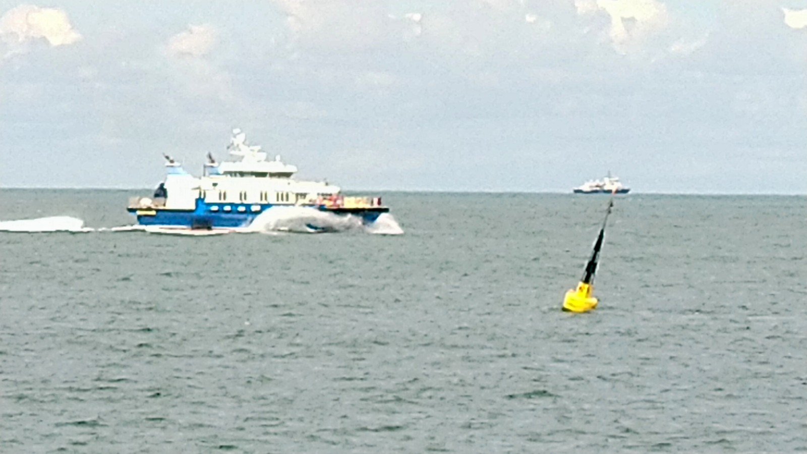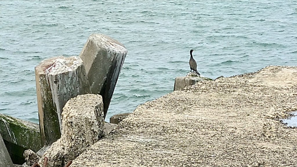 An der Ostecke zum Nordstrand erstreckt sich eine Mole nach Norden. Ein Seevogel wartet dort auf den passenden Fisch und ein Serviceboot der Windkraftindustrie zieht seine Bahn.