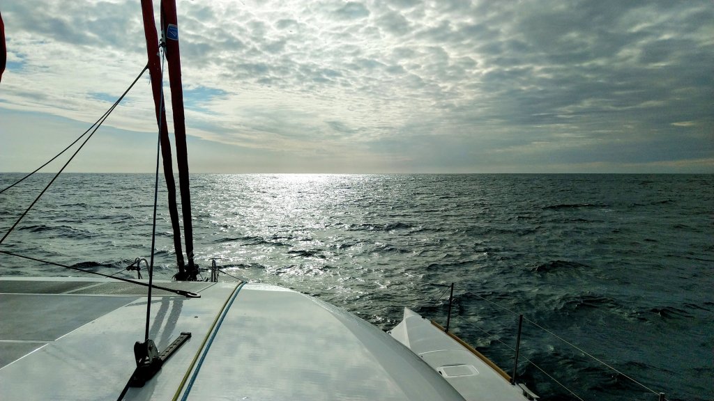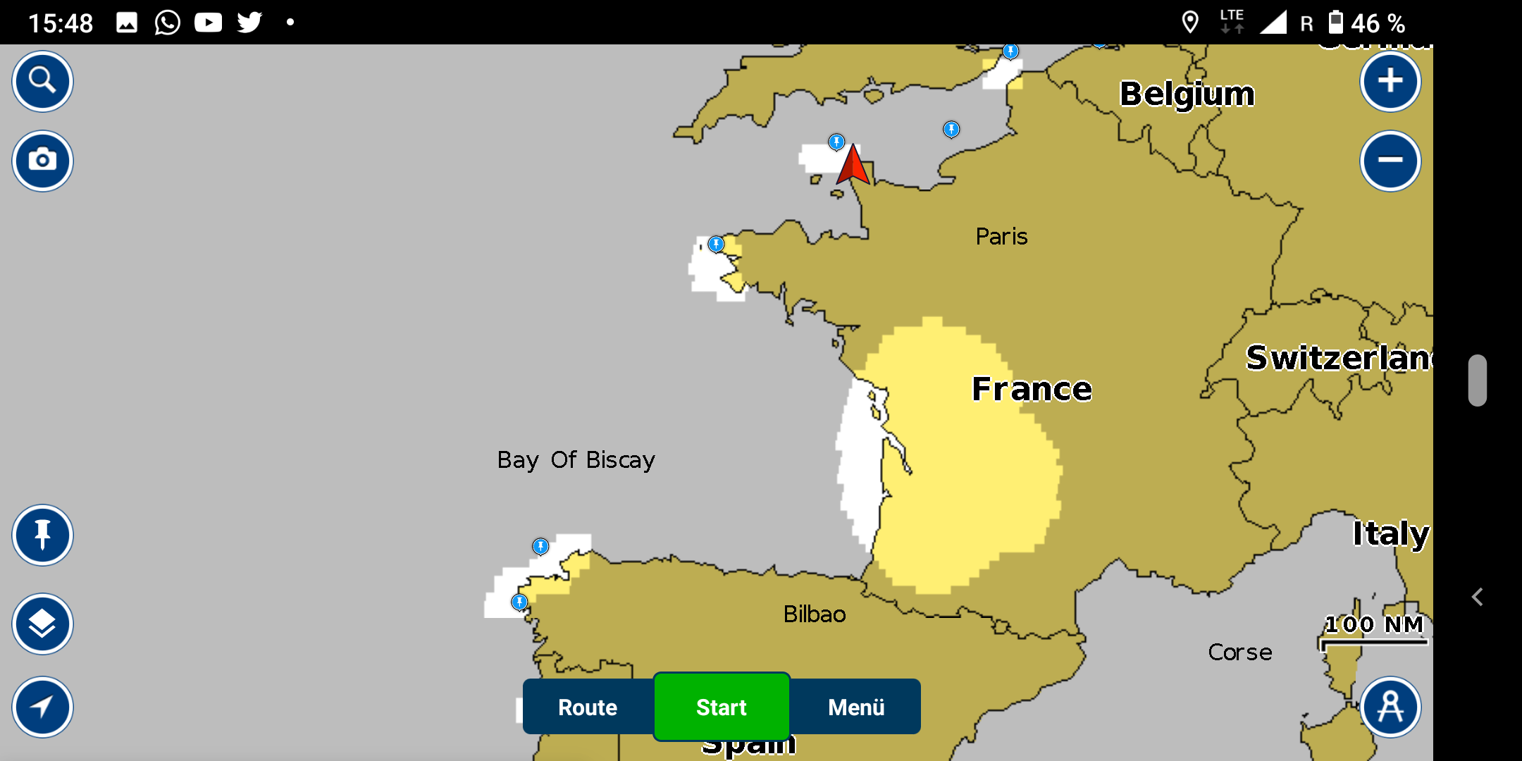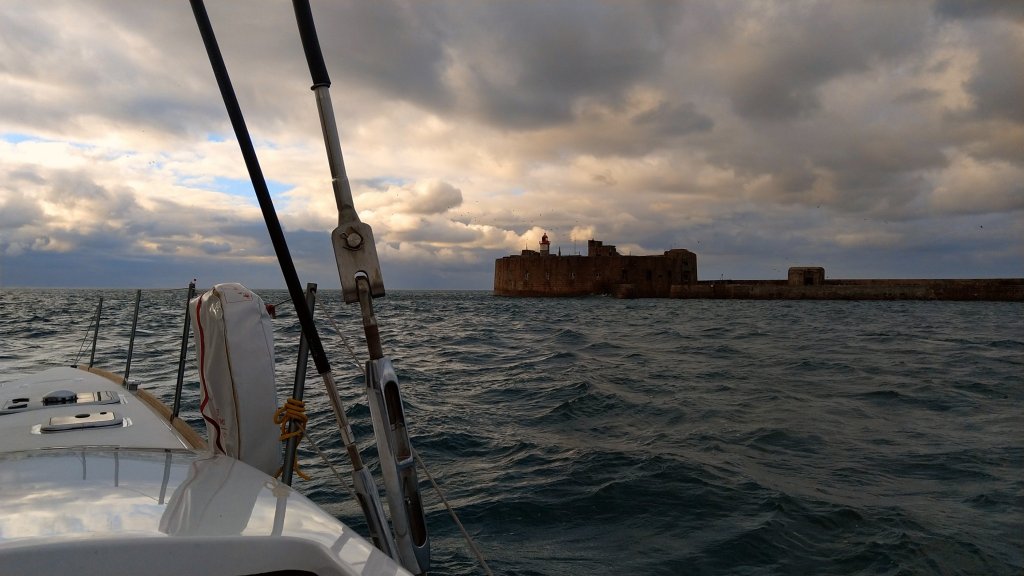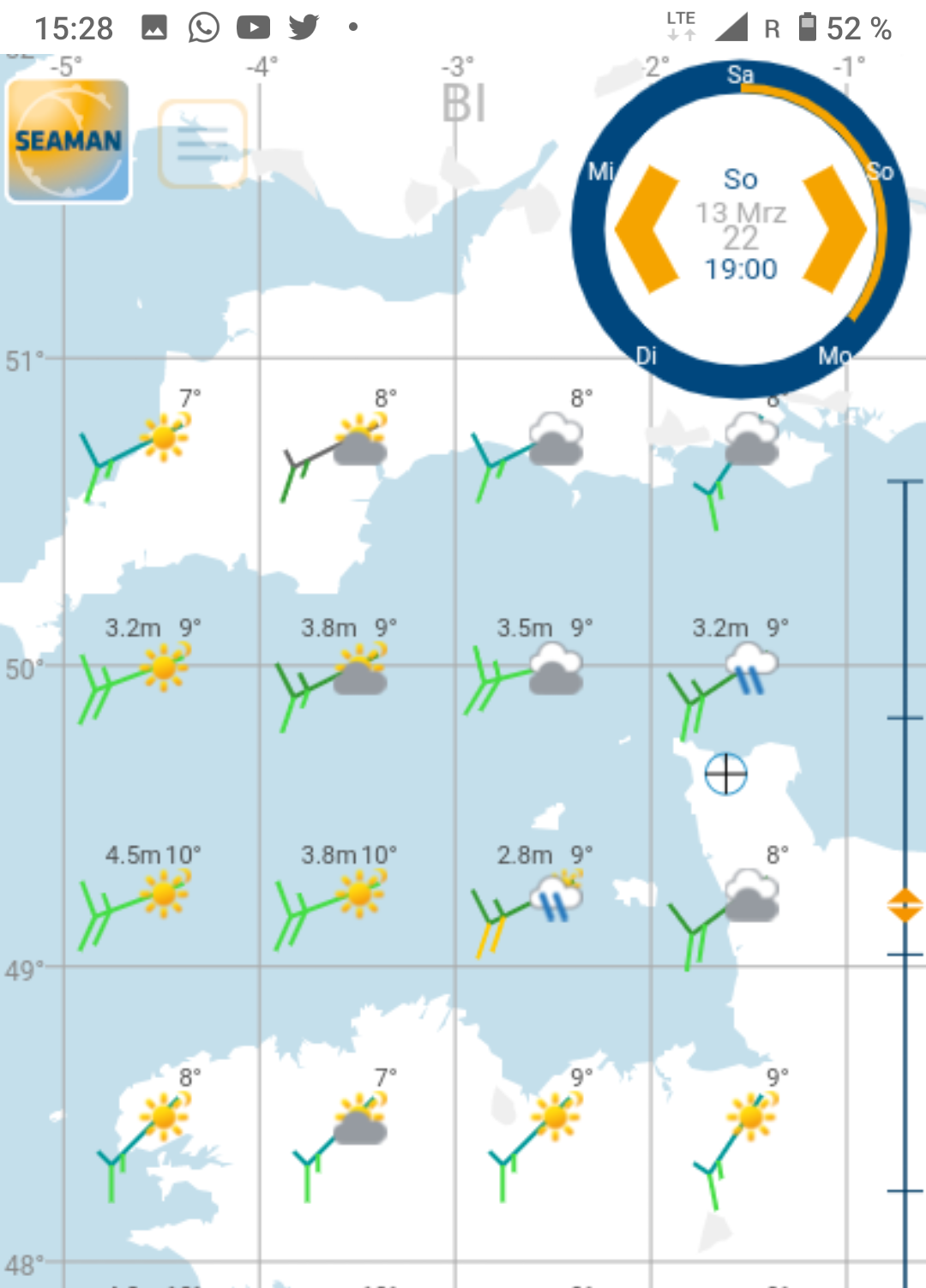 Erwartungsgemäß hatten wir gestern bei unserem Kurs nördlich von Alderney ziemlich rauhes Wasser. Aber es lief den Umständen entsprechend gut. Cap de Hague passierten wir gegen 20:30, Alderney um 22:00 und die Casquets um 23:30. Von dort dann Kurs (und immer noch) 235 Grad Richtung Ile de Quessant. Bis dahin sind es jetzt noch ca. 35 sm.