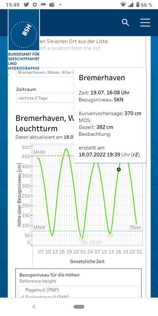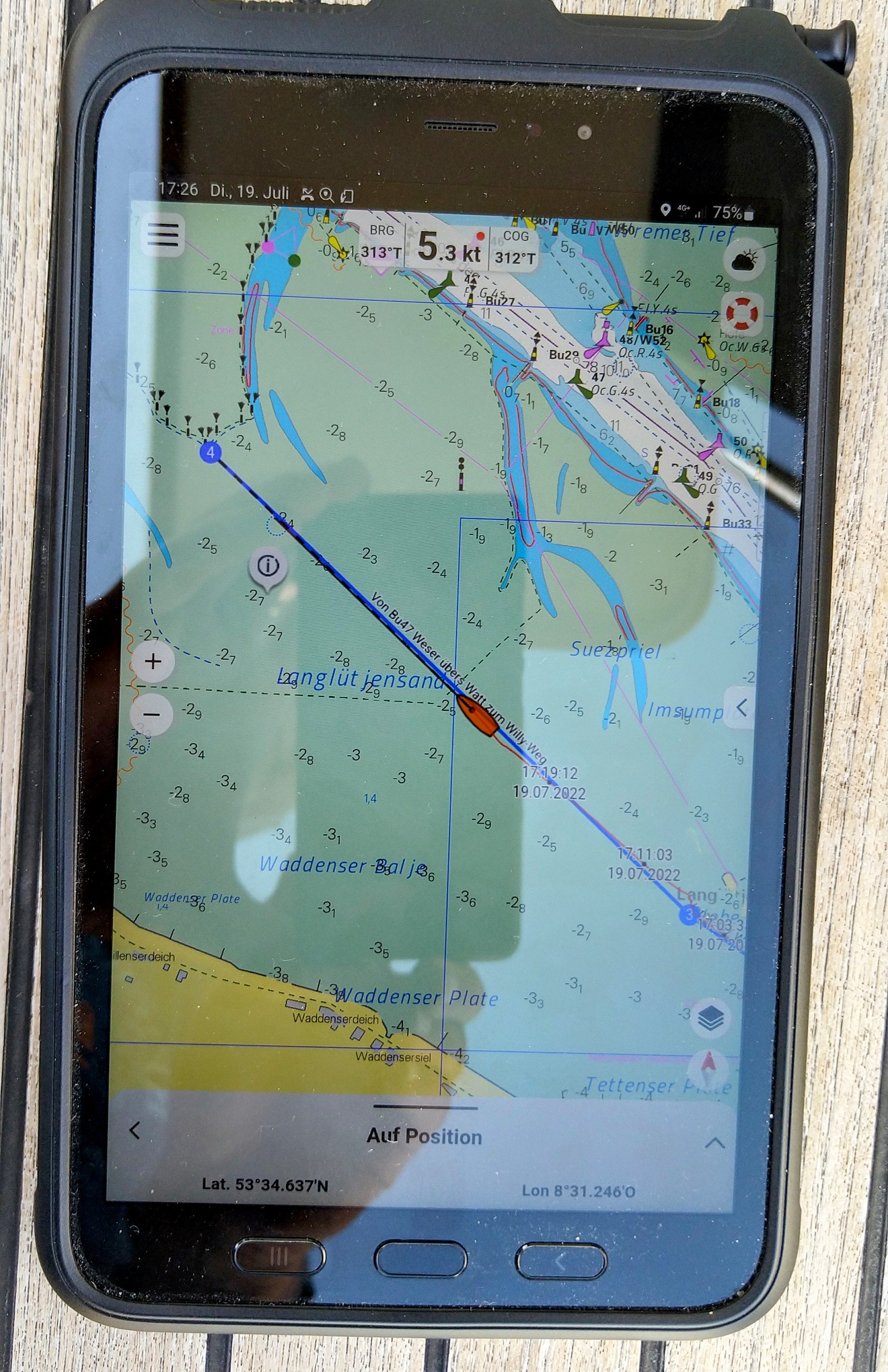 Schon gleich beim Stückgut-Terminal 2 h vor HW rauf ins Watt. Mit der prognostizierten Wasserhöhe über SKN von 3,8 m sollten wir auf dem Wattrücken mit 2,5 m Höhe keine Probleme bekommen. Und so war es auch ! Die geringste geloggte Tiefe war 1,2 m – also noch jede Menge Wasser unter dem Kiel.